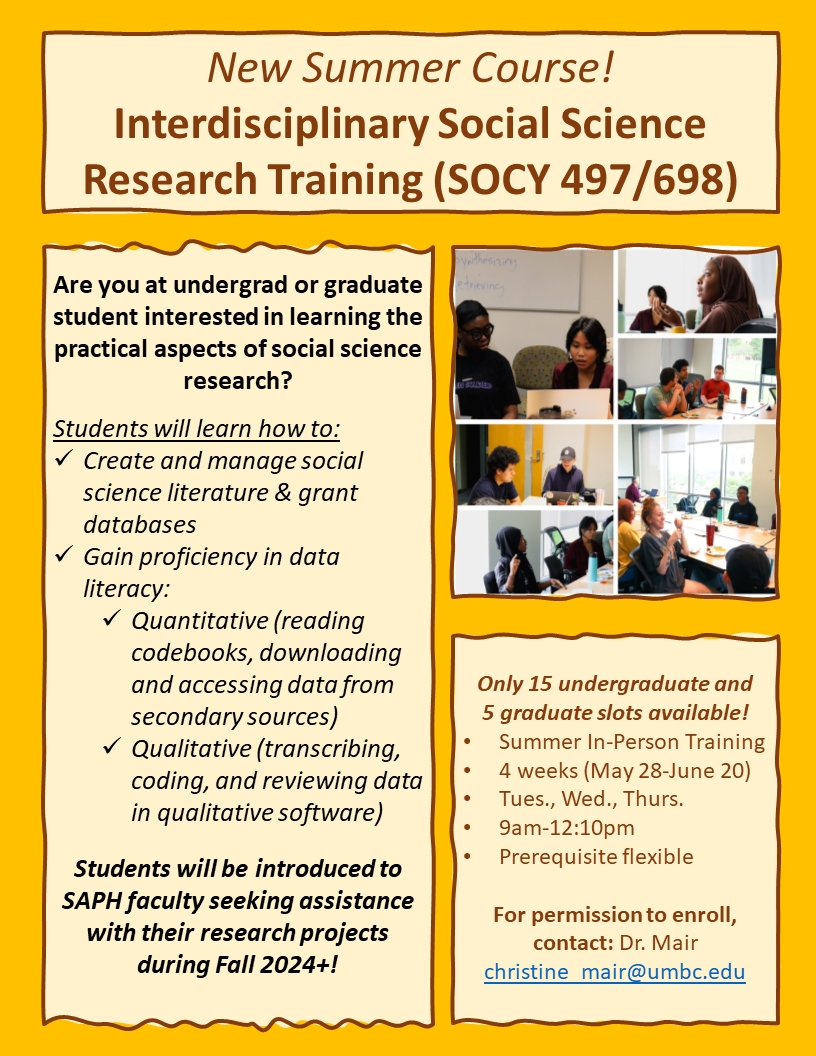 Our department is offering a brand new summer course on "Interdisciplinary Social Science Research Training" (SOCY 497/698). This course will be in-person 3x/week (T W Th, 9am-12:10pm from May 28-June 20). It is open to all UMBC students, but priority will be given to majors in Sociology, Anthropology, or Public Health as well as students in our Applied Sociology MA program.