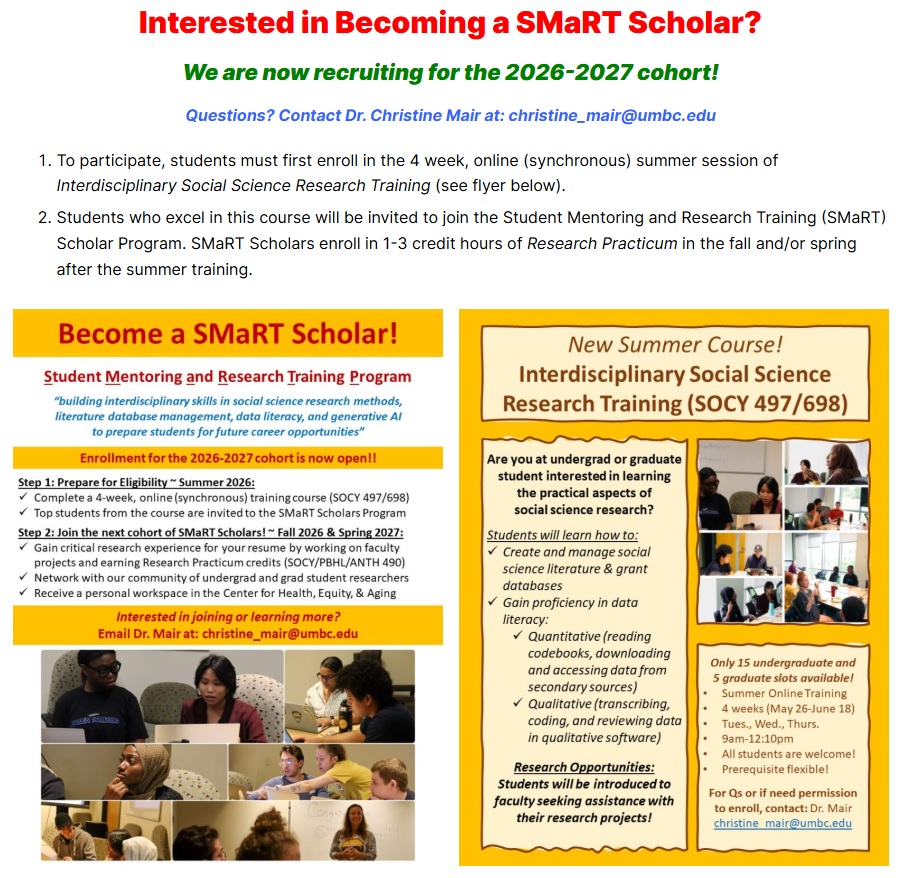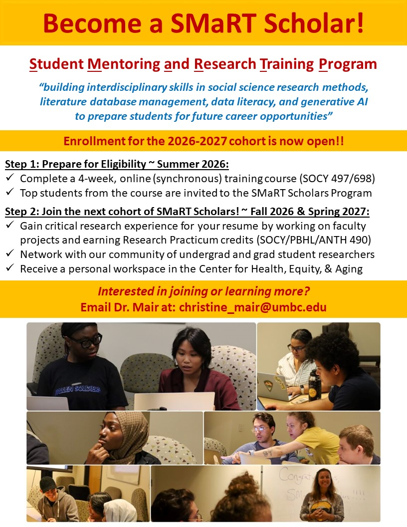 The Center for Health, Equity, & Aging (CHEA) and the Department of Sociology, Anthropology, and Public Health (SAPH) are now recruiting for the 2026-2027 cohort of SMaRT (Student Mentoring and Research Training) Scholars program.