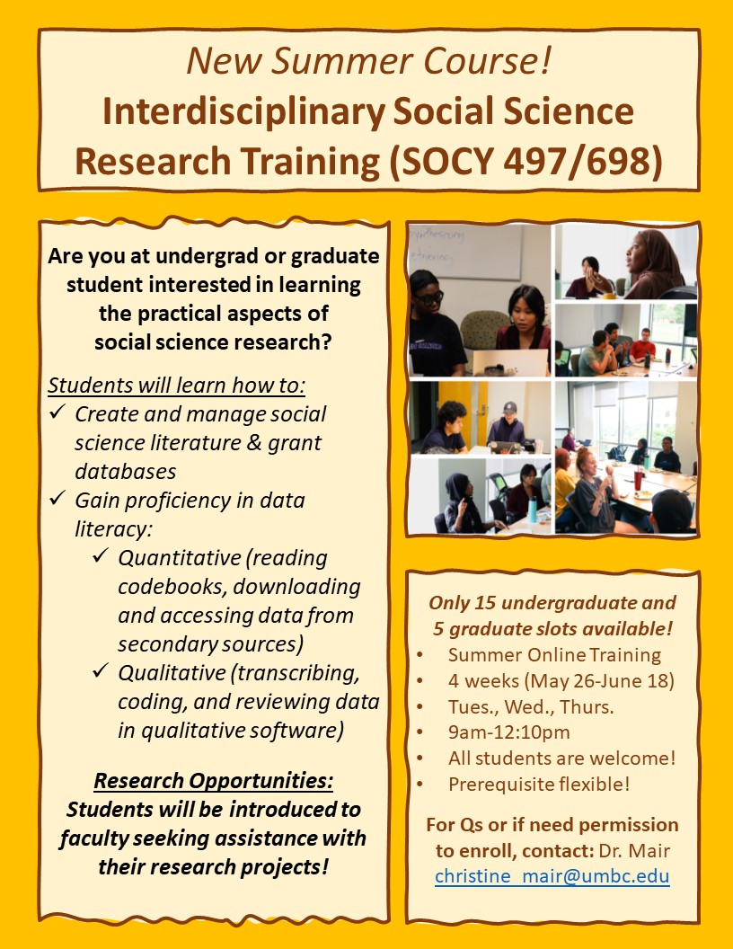 This program is a hands-on opportunity to get involved in research with faculty in public health, sociology, and anthropology. As part of the program, students enroll in a structured summer course (SOCY 497/698, that provides training in research methods, professional development, and key topics in health, alongside direct faculty mentorship and participation in active research projects. SMaRT is ideal for students who are curious, motivated, and interested in building skills for their resumes, graduate school, or careers in health and social science fields.