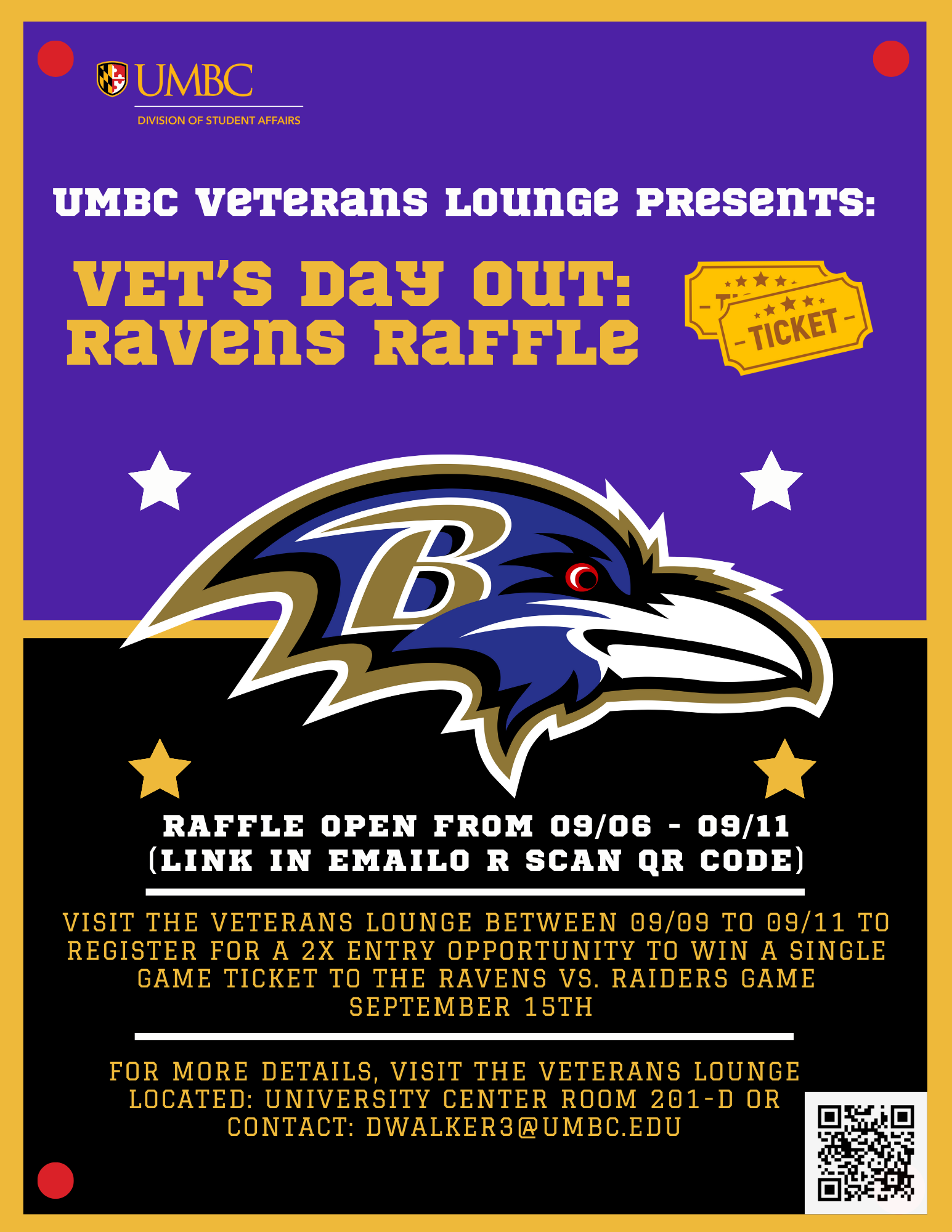 To enter into the raffle, we recommend stopping by the Veteran's Lounge located at the University Center Room 201-D for a double entry, or you can fill out this form for one raffle entry. Ravens Raffle Form