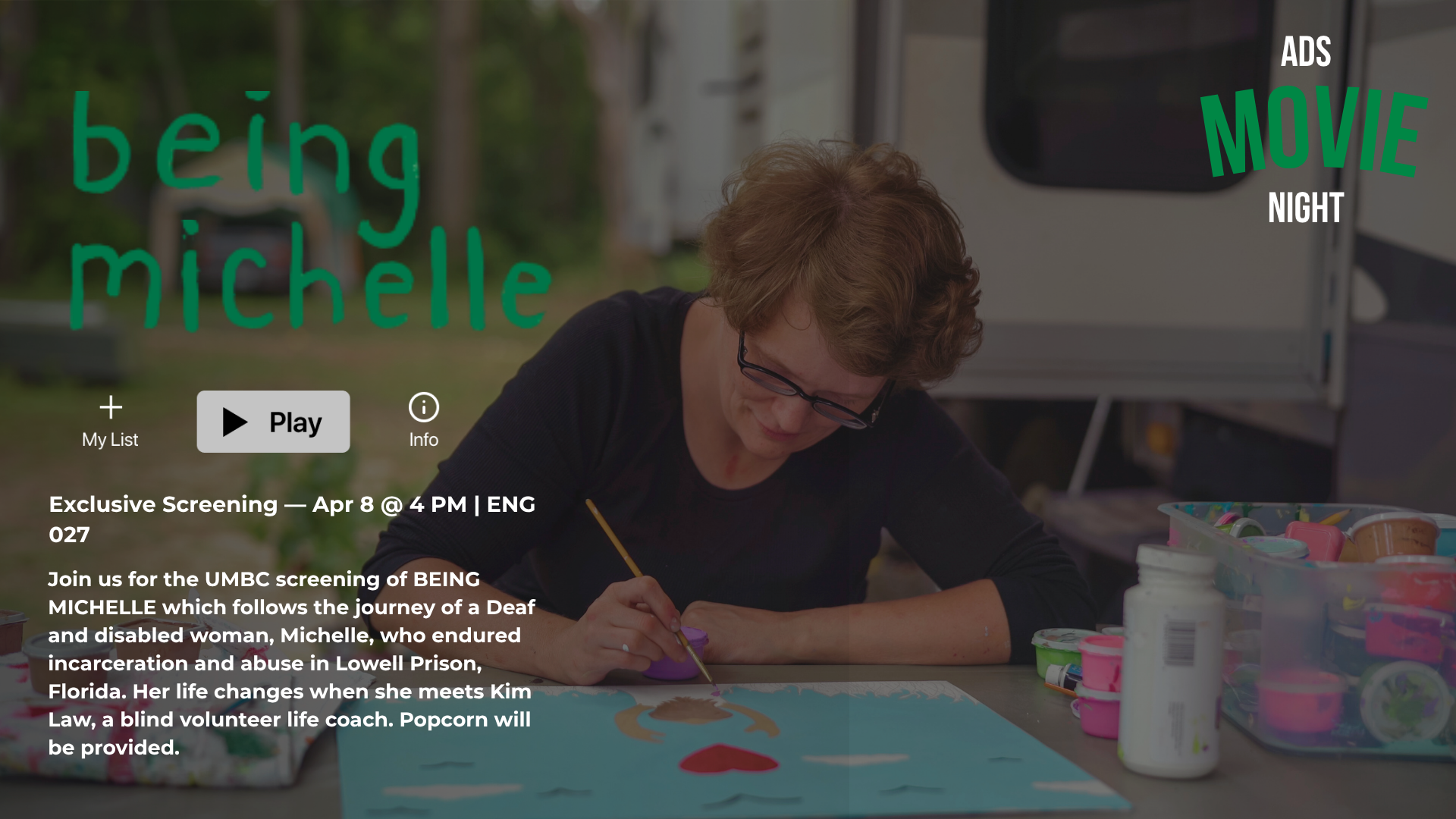 Join us for the UMBC screening of BEING MICHELLE which follows the courageous journey of a Deaf and disabled woman who survived incarceration and abuse under unimaginable circumstances by a system that refused to accommodate her needs as a Deaf person with autism in Lowell Prison, Florida. Michelle's trajectory changed when she met Kim Law, a blind volunteer life coach who teaches classes to people in prison. Popcorn will be provided.