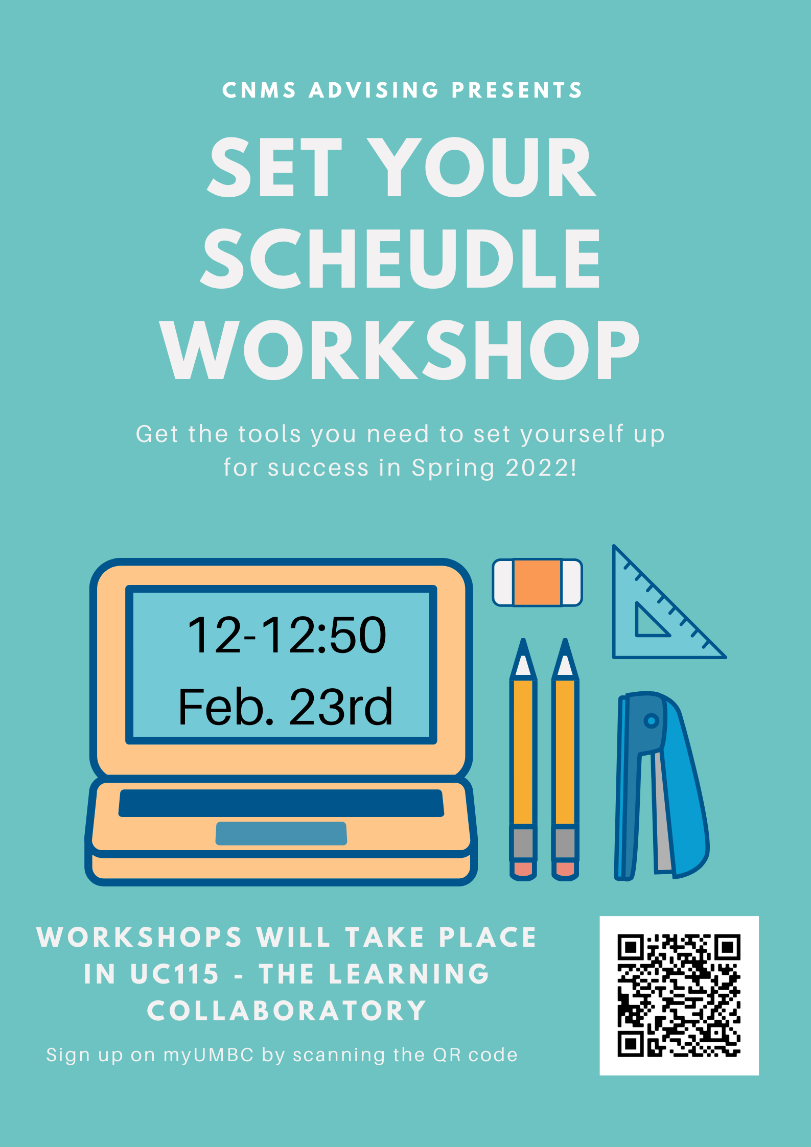 CNMS Student Success Coach Emma Barnaby will be holding a workshop tomorrow (Wednesday 2/23) in The Learning Collaboratory (UC 115) from 12-12:50 on how to create a schedule that works for you. Learn tips and tricks on how to make time for all your assignments as well as your extracurriculars and still get enough sleep!