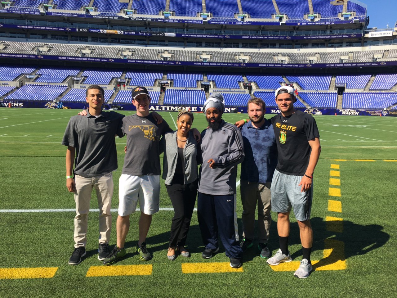 Pictured L to R at M&T Bank Stadium: UMBC students and alums Kevin Harris, Taylor Crimmel, Karlise Simpson, Jerome Graham, Dustin Roddy, Jordan Becker.