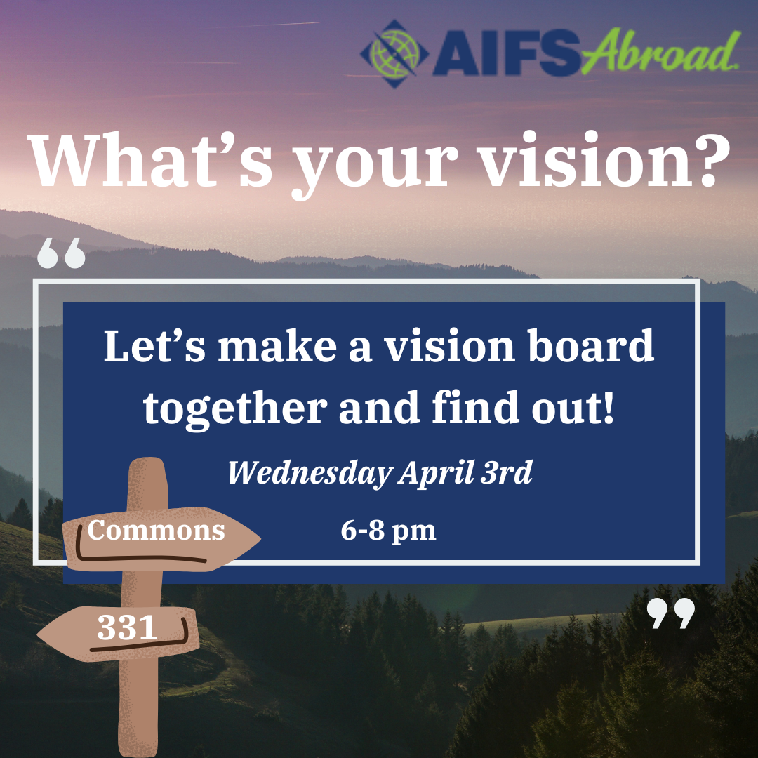 Are you interested in studying abroad? Stop by Commons 331 on Wednesday April 3rd from 6-8 pm to make a vision board on Canva with Kate, our AIFS Study Abroad Ambassador. See you there!!