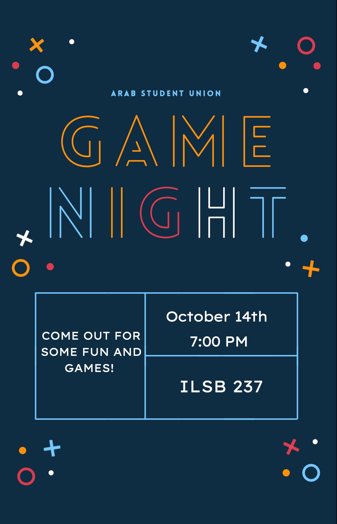 This Thursday, October 14th at 7:00 pm, we will be having a game night in ILSN 237. Pease feel free to bring some games if there are ones you want to play. I hope to see you there!