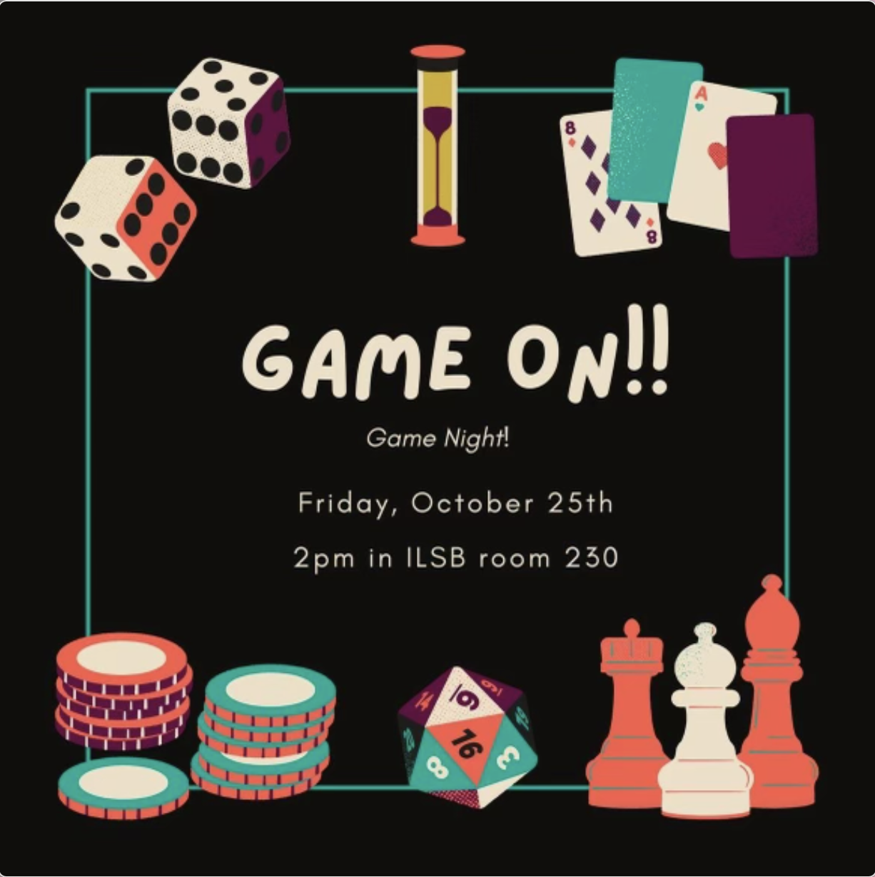 The Arab Student Union (ASU) is excited to invite you to our Game Night this Friday at 2 PM in ILSB 230. Join us for a fun afternoon filled with board games and good company. It's a perfect chance to relax, connect with others, and have some fun!