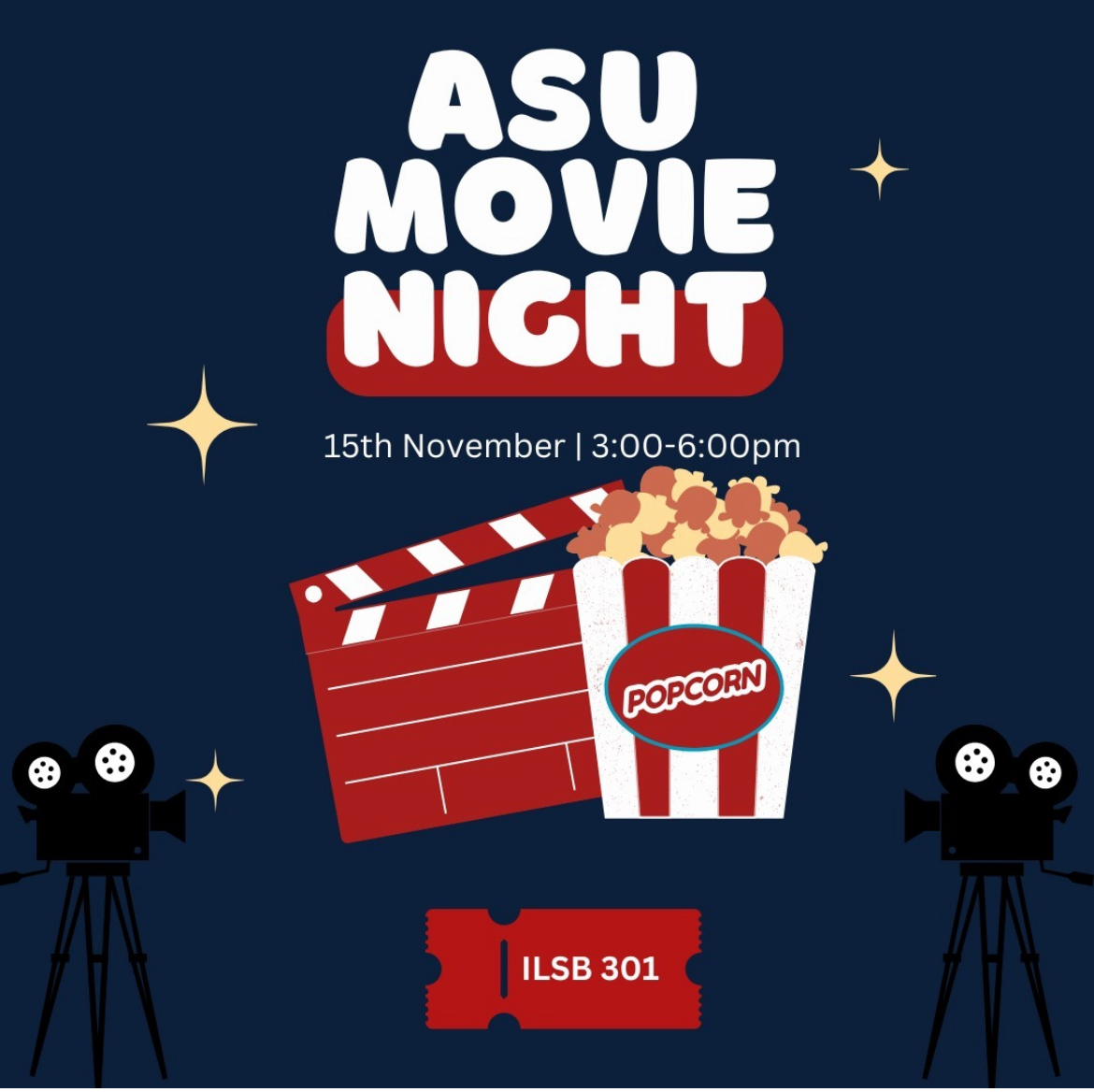 ASU will be hosting a movie night this Friday from 3:00 to 6:00 PM in ILSB 301. This is the perfect time to unwind and kick off the weekend!