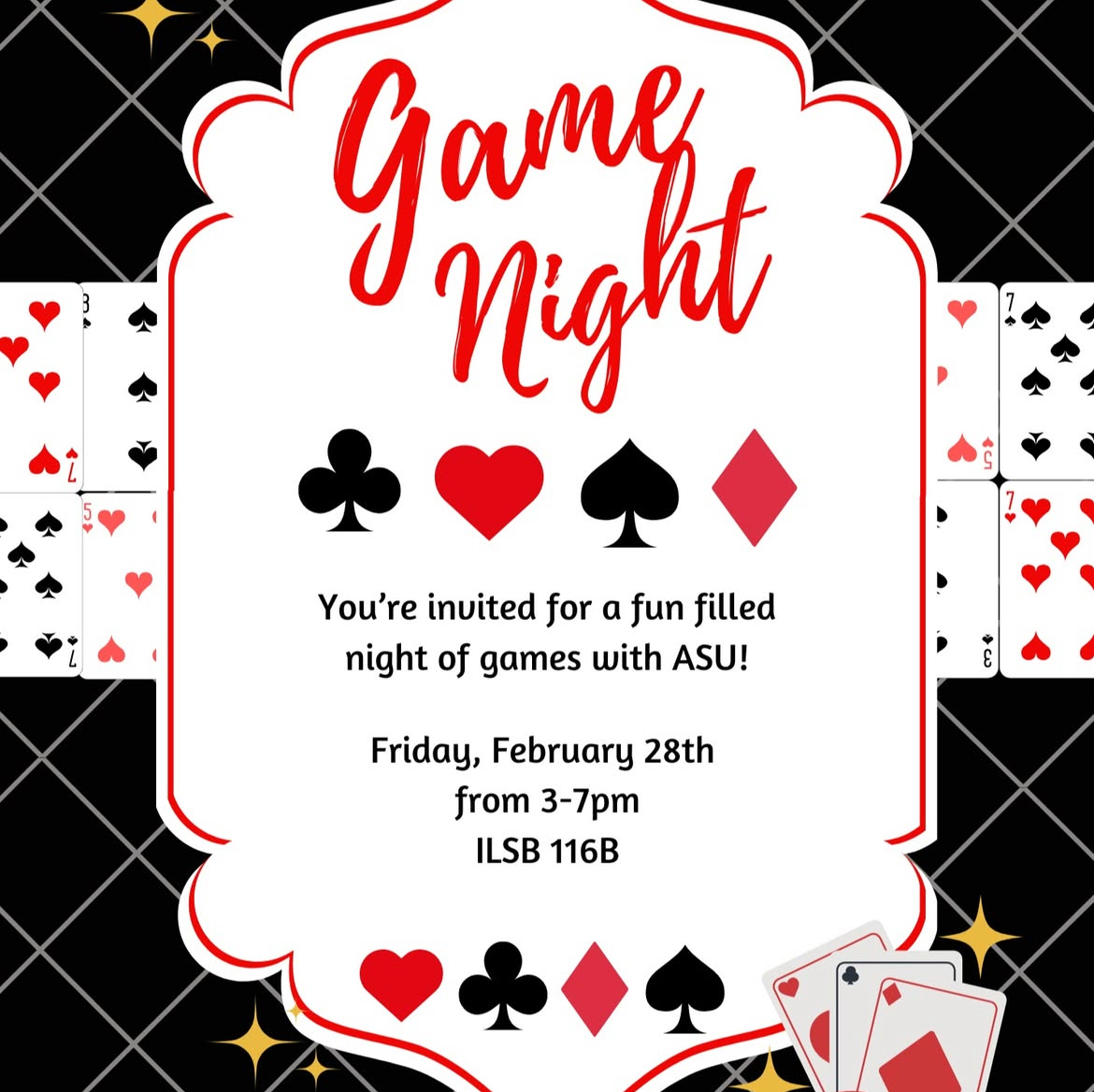 Take a break and join us for Game Night this Friday, February 28th, from 3–7 PM in ILSB 116B! We'll have a variety of board games, card games, and more—so bring a friend and enjoy a fun, relaxing evening.