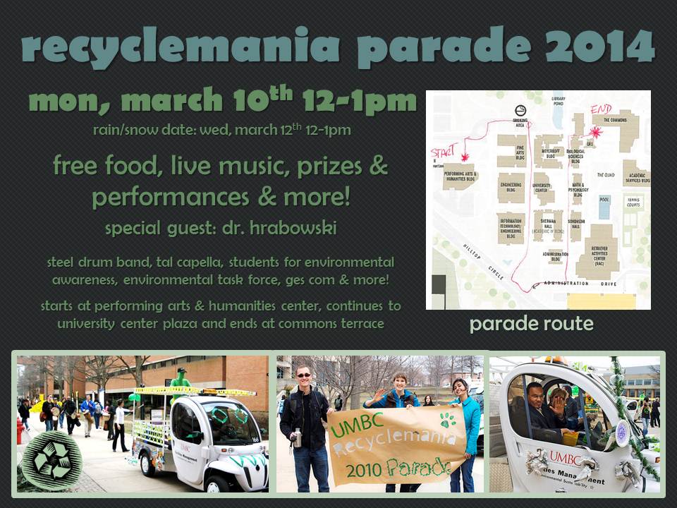 The RecycleMania Parade will be taking place on Monday, March 10, 2014 at 12PM at the Performing Arts & Humanities Center. It will continue down to the university Center Plaza with a speech from President Hrabowski and end with a celebration at the Commons Terrace.