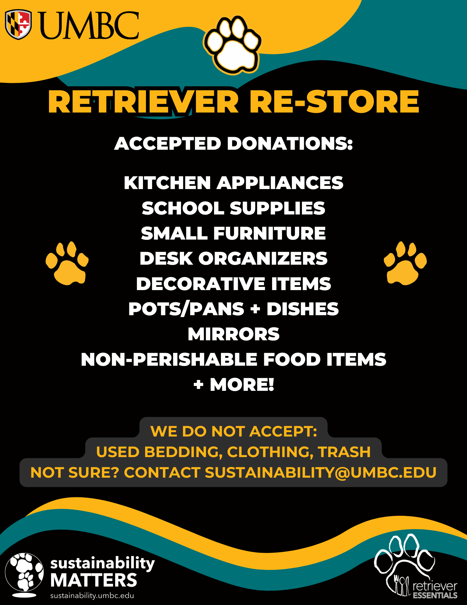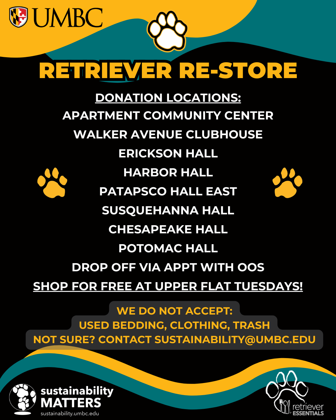 See the attached flyers for a list of accepted items and donation locations. Learn more at https://sustainability.umbc.edu/home/campus-initiatives/ If you are a staff/faculty member interested in donating, please email us to set up a donation appointment.