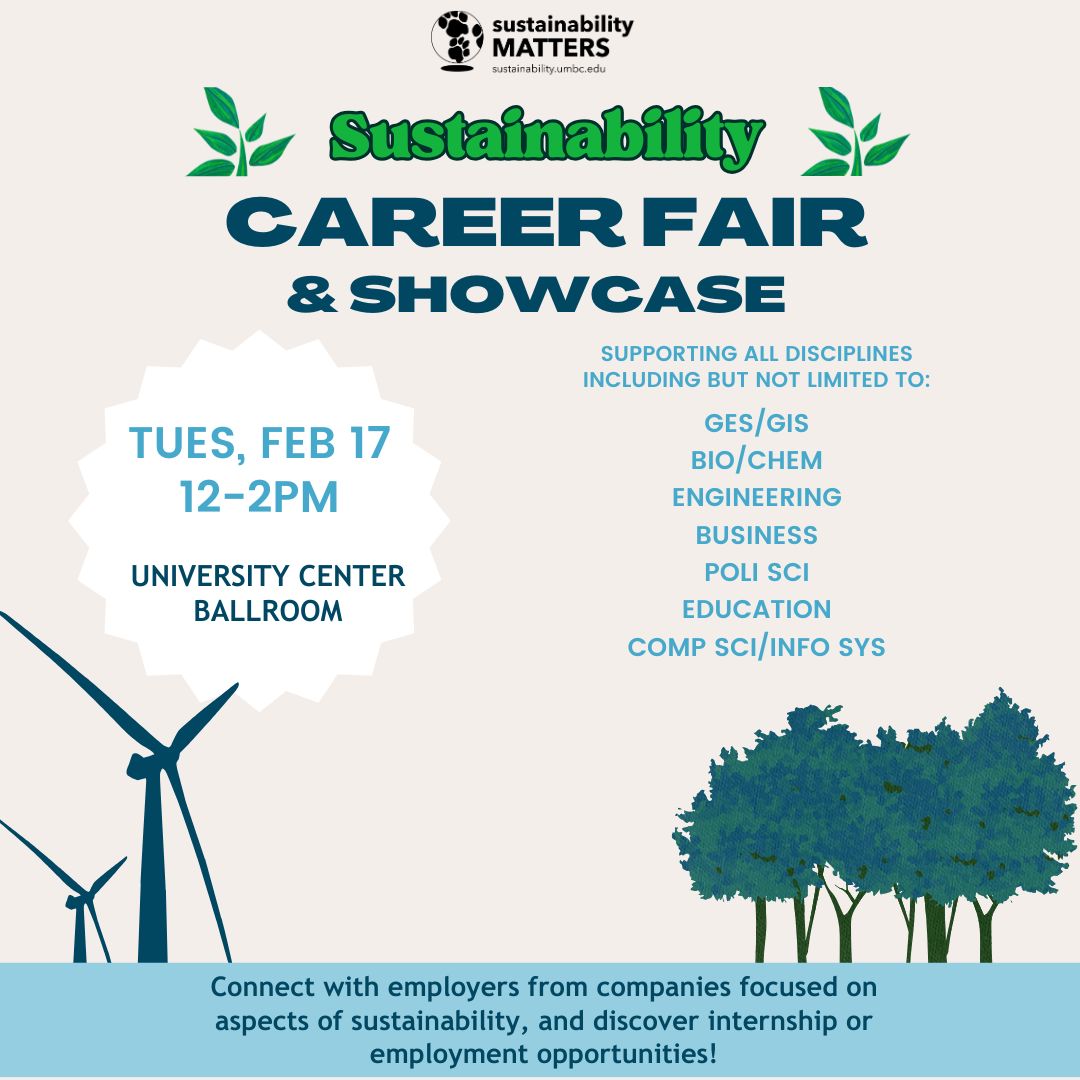 Join us for the annual Sustainability Career Fair and Showcase on Tuesday, Feb 17th at 12pm. Stop in to talk to employers for a potential role in a company that values and incorporates sustainability into their work, or learn more about what career options may await you if you are interested in sustainability!
