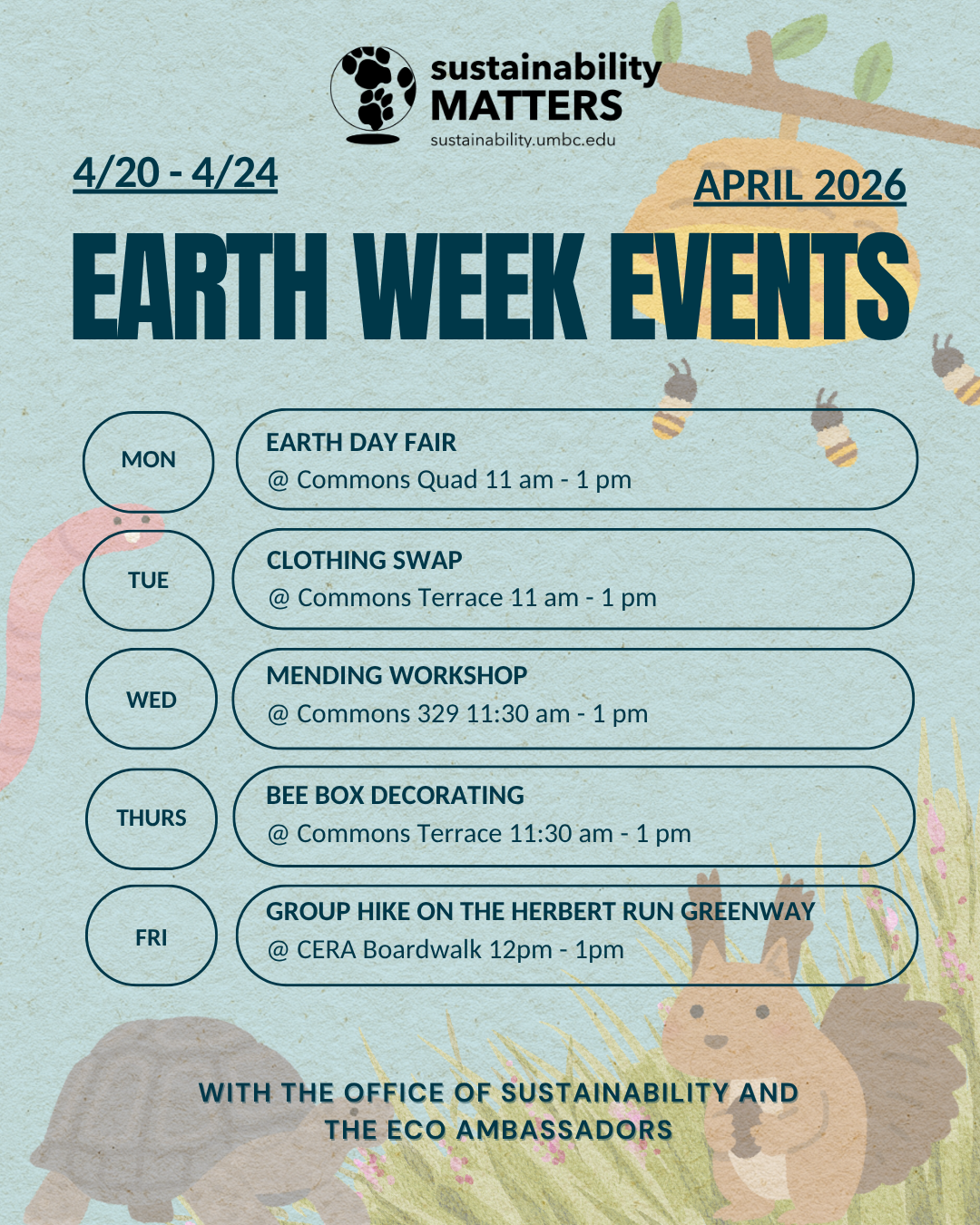 Celebrate Earth Day all week with the Office of Sustainability and the Eco-Ambassadors! All students, staff and faculty are welcome to join the celebrations.
