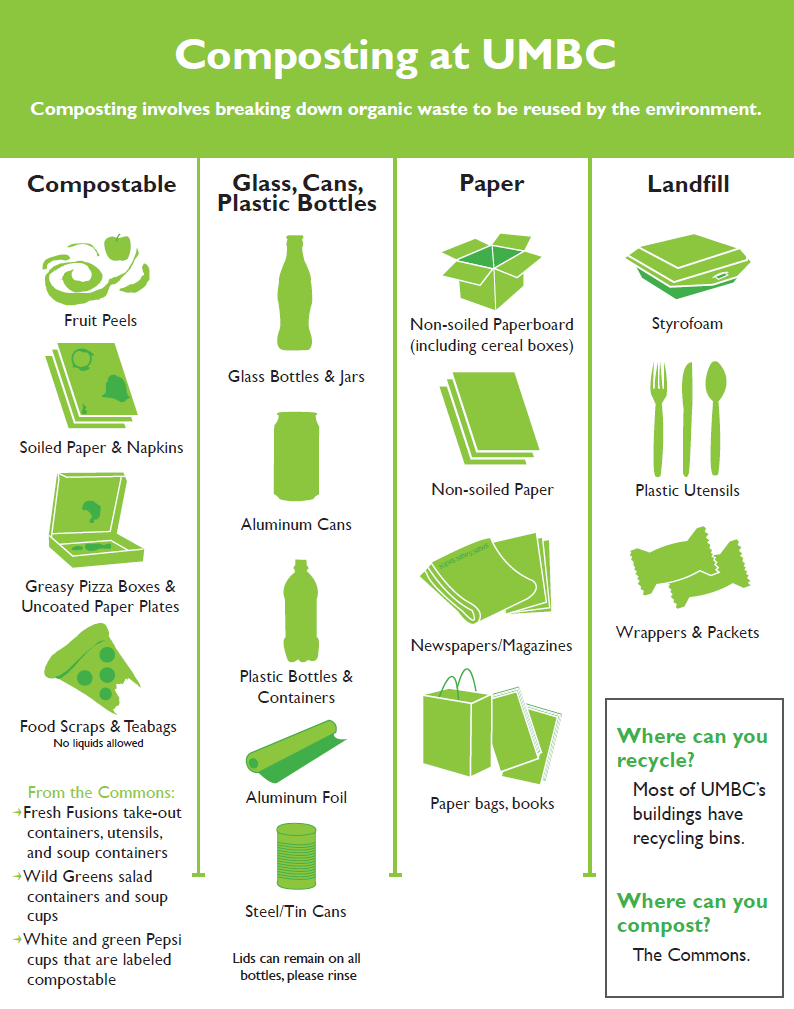 We were able to start composting our food waste in 2012 thanks to the efforts of SGA Sustainability Intern Madeline Hall (featured in the composting video below), and a coordinating committee including student leaders, our dining provider Chartwells, contract coordinators Campus Card, our green housekeeping group, and the company who picks up our compost and returns the decomposed food as fertile soil, Waste Neutral, as well as Facilities Management and UMBC's Sustainability Coordinator!