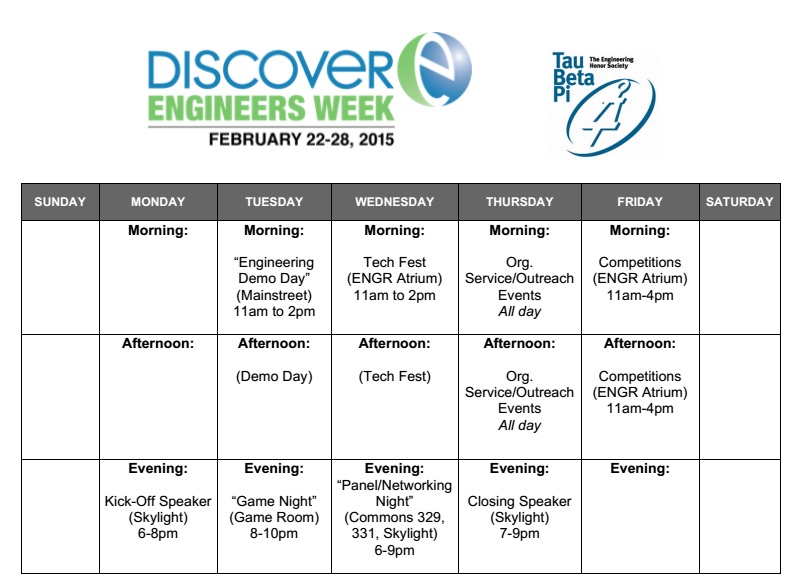 Hey SWEethearts! Happy Valentine's Day! Engineer's Week is coming soon, get excited! It will be from February 22-28. Every day that week, there will be a different fun event to show off what engineers do here at UMBC and in the real world. On Tuesday, February 24 from 11AM-2PM is demo day in Common's Mainstreet where many Engineering student orgs will have tables advertising some of the awesome things we do. SWE is making a slingshot with a velcro ball and target and computer program calculating optimal trajectory. We need your help showing passer-byers how to use the program and slingshot, as well as talking about SWE. You can sign up on this Google Doc: https://docs.google.com/a/umbc.edu/spreadsheets/d/1TTpr9TCOkpp2T373vXuDESCAaFxCCOqRKYwEEzMqGLc/edit?usp=sharing and email me at tshukla1@umbc.edu with any questions! At the event, we will show you how to use our set-up (it shouldn't be too complicated). Like the UMBC Engineer's Week page on Facebook for updates and more info! The calendar of events for the week is attached.