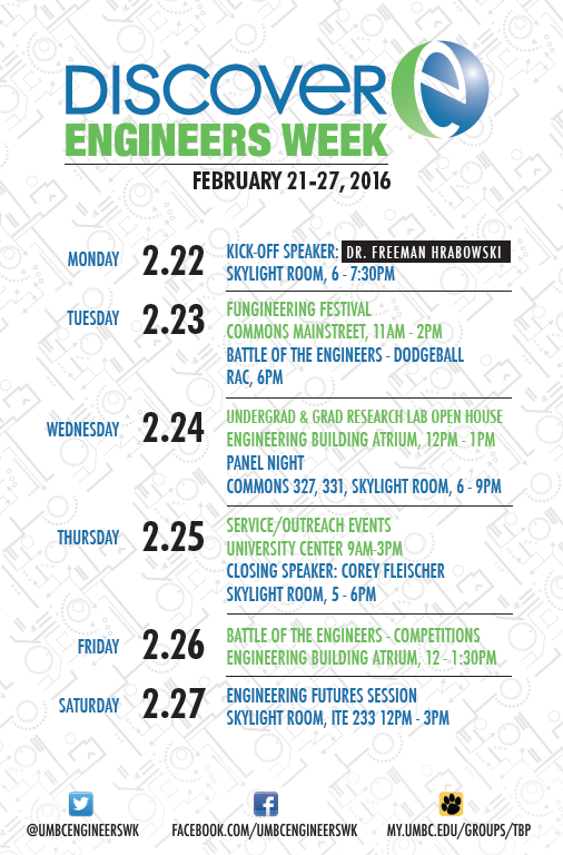 Who's ready for the 2nd annual UMBC Engineers Week? Join us February 22-26, 2016 as we celebrate how engineers make a difference!