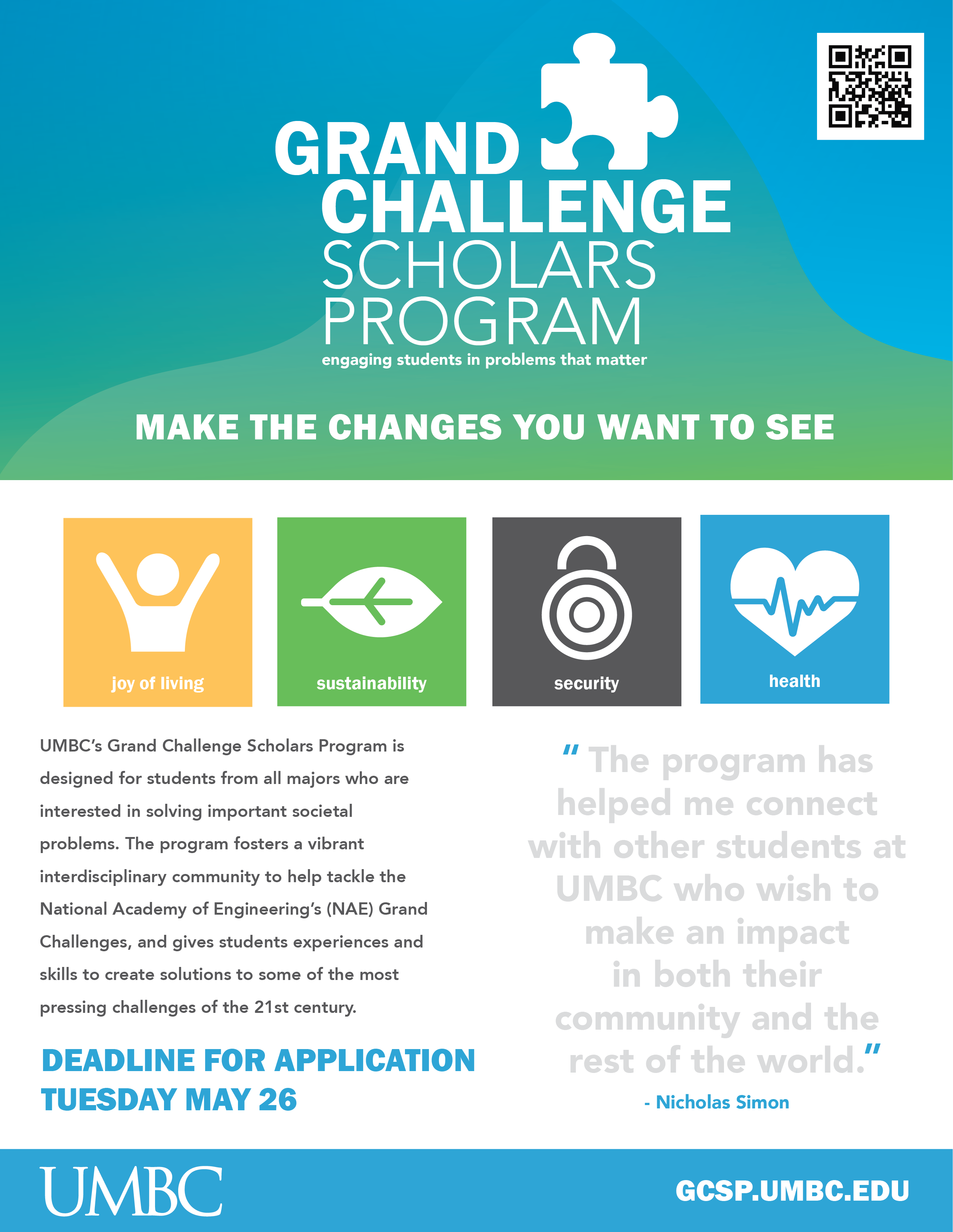 UMBC’s Grand Challenge Scholars Program is designed for students from all majors who are interested in solving important societal problems. The program fosters a vibrant interdisciplinary community to help tackle the National Academy of Engineering’s (NAE) Grand Challenges, and gives students experiences and skills to create solutions to some of the most pressing challenges of the 21st century.