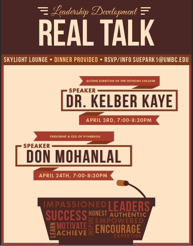 Let's get down to some real talk! On April 3rd in the Skylight Lounge, from 7:00 pm to 8:30 pm, there will be an experience to grow and exchange thoughts by talking with experienced leaders like Don Mohanlal, the President and CEO of Synergos! Dinner will be provided! For more information or to RSVP, email SuePark1@umbc.edu.
