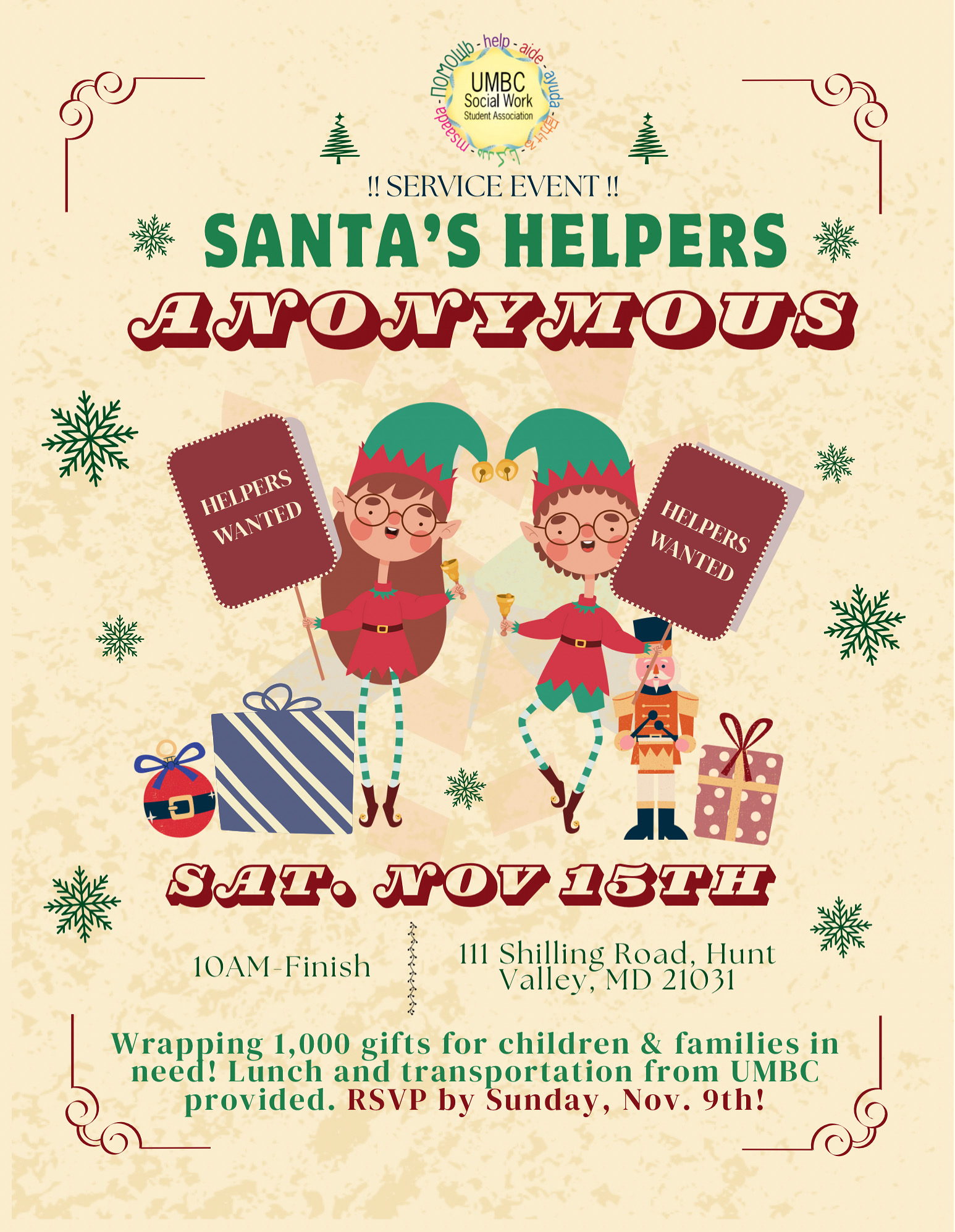 Help bring some holiday cheer to the children of Baltimore by volunteering with us for Santa's Helpers Anonymous on November 15th at 10am! We'll be wrapping 1,000 gifts for families in need. Please RSVP using this form: https://forms.gle/mDkaH5ShM4dzbsii8 by Sunday, Nov. 9th! Lunch and transportation from UMBC will be provided. Have a lovely rest of your week:)