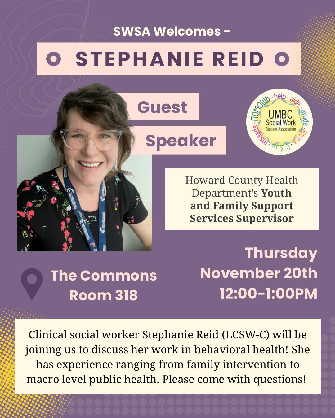 Come meet Howard County Health Department's Youth and Family Support Services Supervisor! Clinical social worker Stephanie Reid (LCSW-C) will be joining us to discuss her work in behavioral health Thursday, November 20th, from 12:00-1:00 PM in the Commons room #318. She has experience ranging from family intervention to macro level public health. If you're interested in behavioral health or learning more about career opportunities as a social work graduate please stop by!