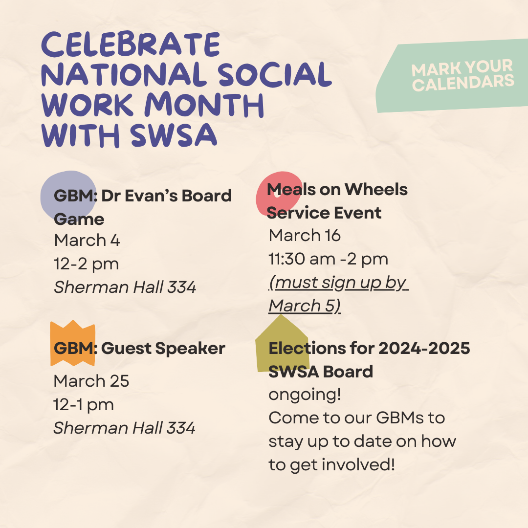 Check out the schedule below for all the SWSA events in March which is National Social Work Month!