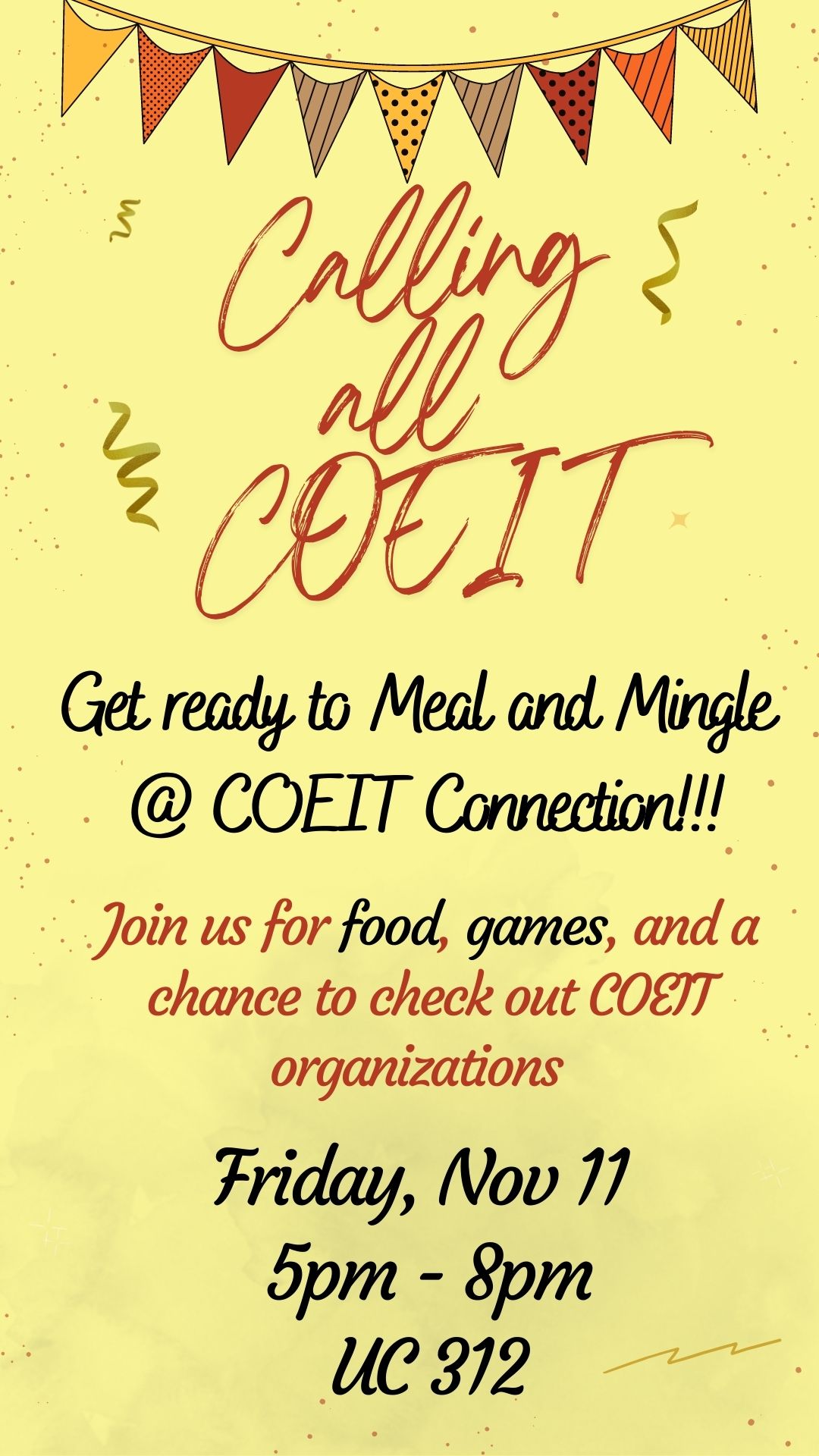 Come out to UC 312 on Friday, November 11th @ 5pm to mingle with your fellow COEIT members, interact with COEIT student organizations, play games, win prizes, and enjoy caterer food.
