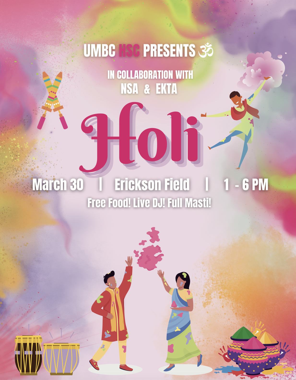 Holi will take place on Monday, March 25th, but is being celebrated on campus by the Hindu Students Council on Saturday, Mar 30th on Erickson Field at 1:00pm. From HSC's advertisement: Join UMBC HSC in celebrating Holi - the festival of colors. There will be free food, colors, and music! The event is open to everyone, we hope to see you there!" Check out HSC's instagram for more information!