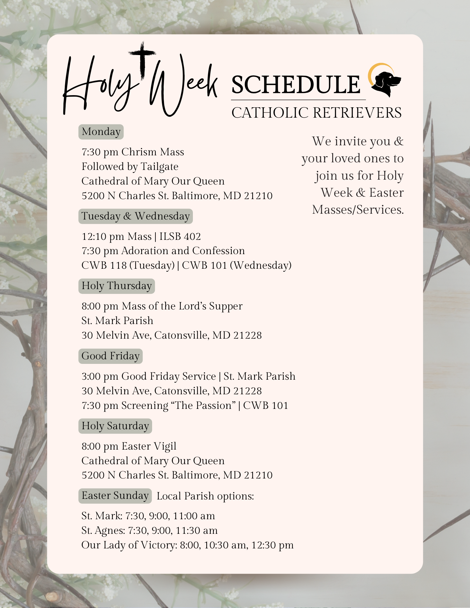 i) Catholic Retrievers: Check Out the Full Calendar of Events Attached Below or Instagram (@umbc_catholics)