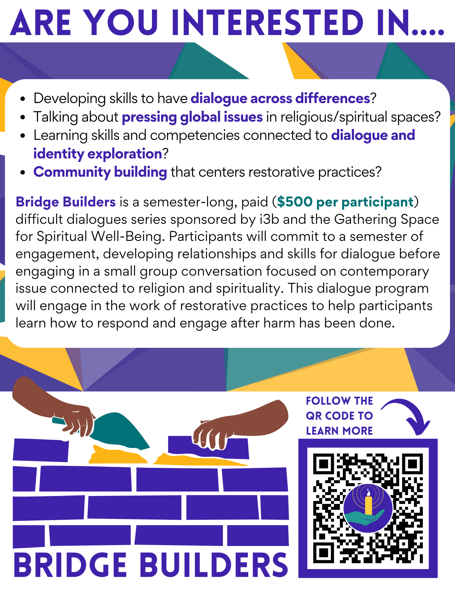 Looking for a way to improve your skills for dialogue? Join our second semester of Bridge Builders, The Gathering Space's difficult dialogue series which launched last fall. This series equips students with skills and tools to have hard conversations across differences. Participants will receive a $500 stipend for the semester. See the attached flyer for more details.
