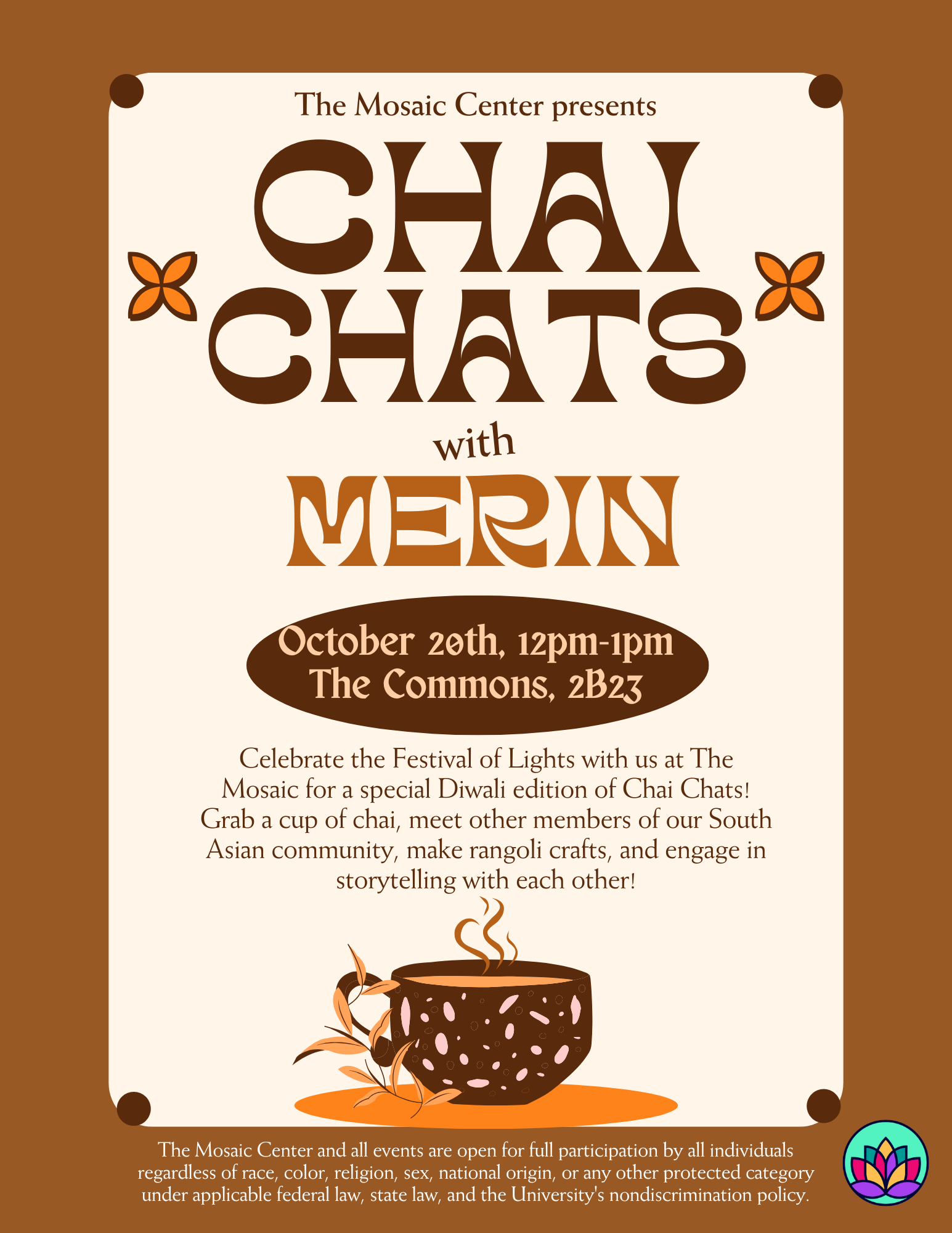 Celebrate the Festival of Lights with us at The Mosaic for a special Diwali edition of Chai Chats! Enjoy a warm cup of chai, connect with other members of the South Asian community, and share stories, traditions, and memories that make this time of year so meaningful. Come for the chai, stay for the community and conversation!