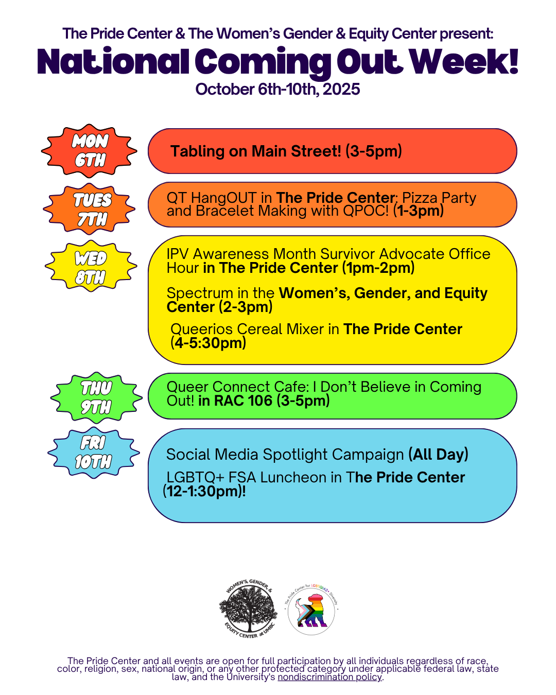 National Coming Out Week is October 6th-11th! Check out our planned events all next week, we'll have something fun every day for you, Retrievers!