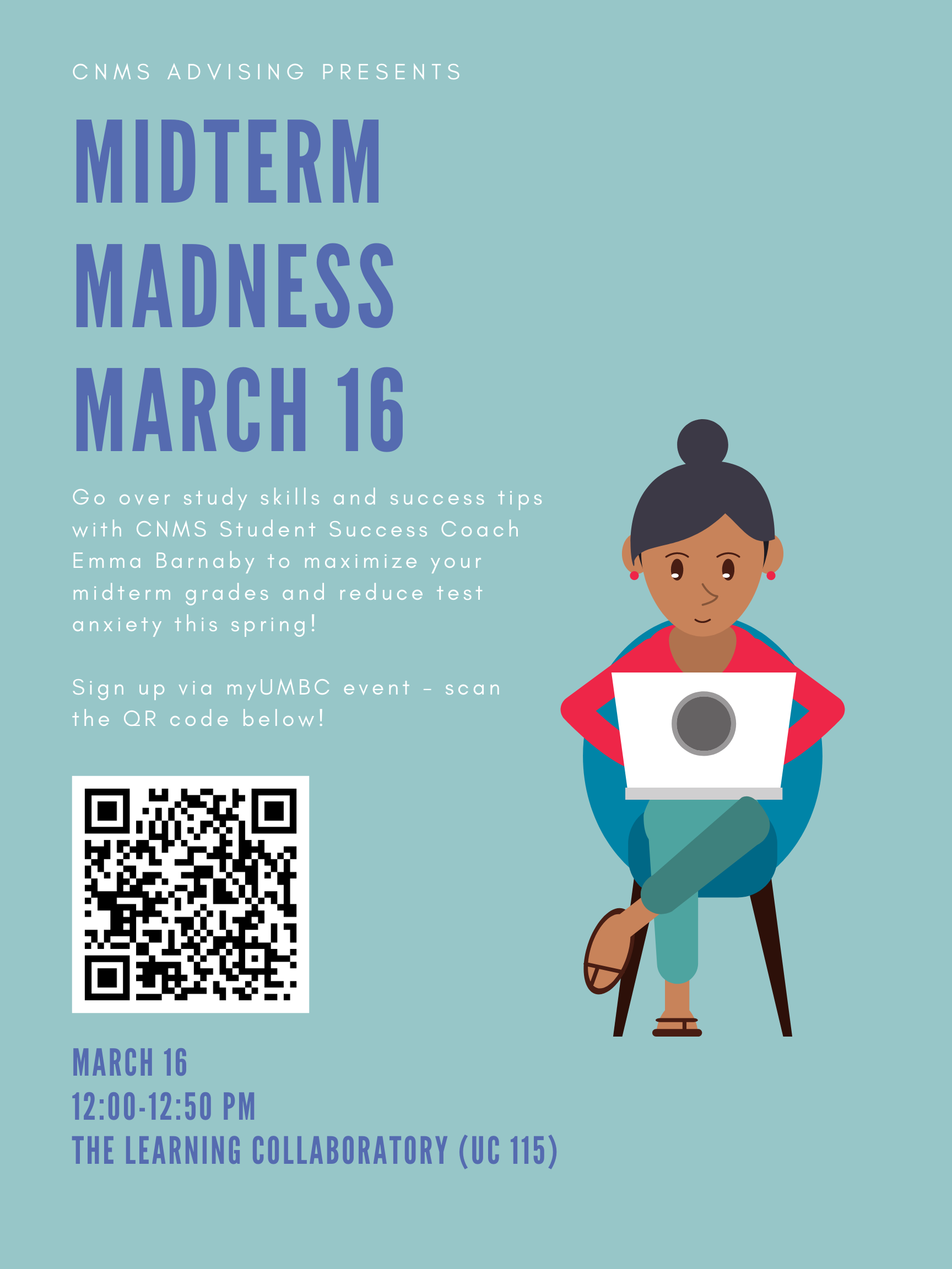 Go over study skills and success tips with CNMS Student Success Coach Emma Barnaby to maximize your midterm grades and reduce test anxiety this spring!