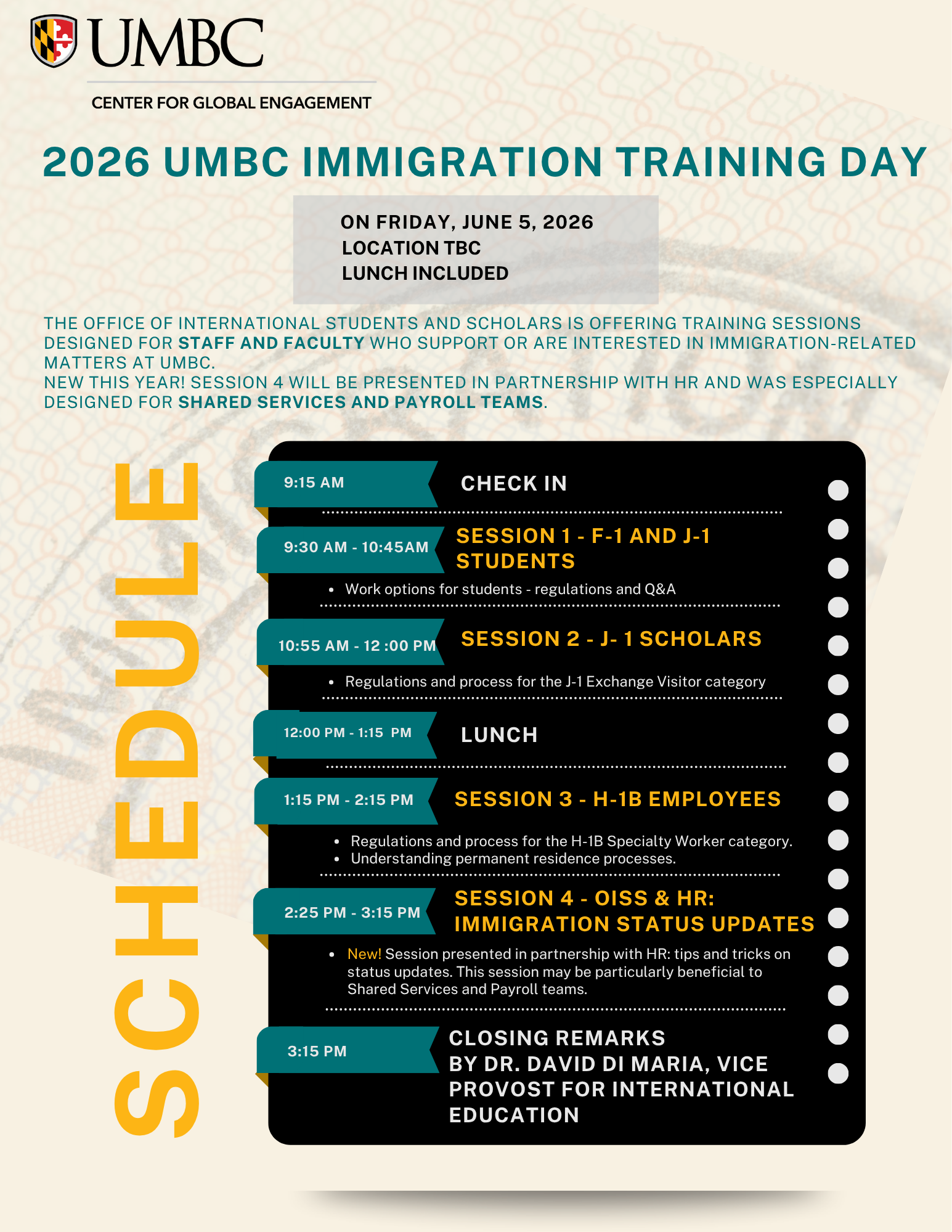 If you’re curious about the immigration options available when hiring international talent at UMBC, you are welcome to join us for a full day of practical training, helpful tips, and guidance tailored specifically to UMBC processes.
