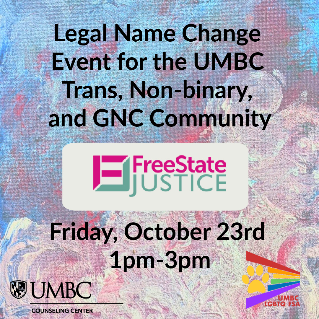 The UMBC Counseling Center and the UMBC LGBTQ Faculty and Staff Association is co-sponsoring a Legal Name Change Event for the Transgender, Non-Binary, and Gender Non Conforming UMBC Campus Community with FreeState Justice. The event will be held virtually on October 23rd from 1pm to 3pm. FreeState Justice will be providing information regarding legal name changes as well as initiate processes for individuals wishing to legally change their names. For more information, contact Dr. Sunny Swift (he/him/they/them) at eswift@umbc.edu.