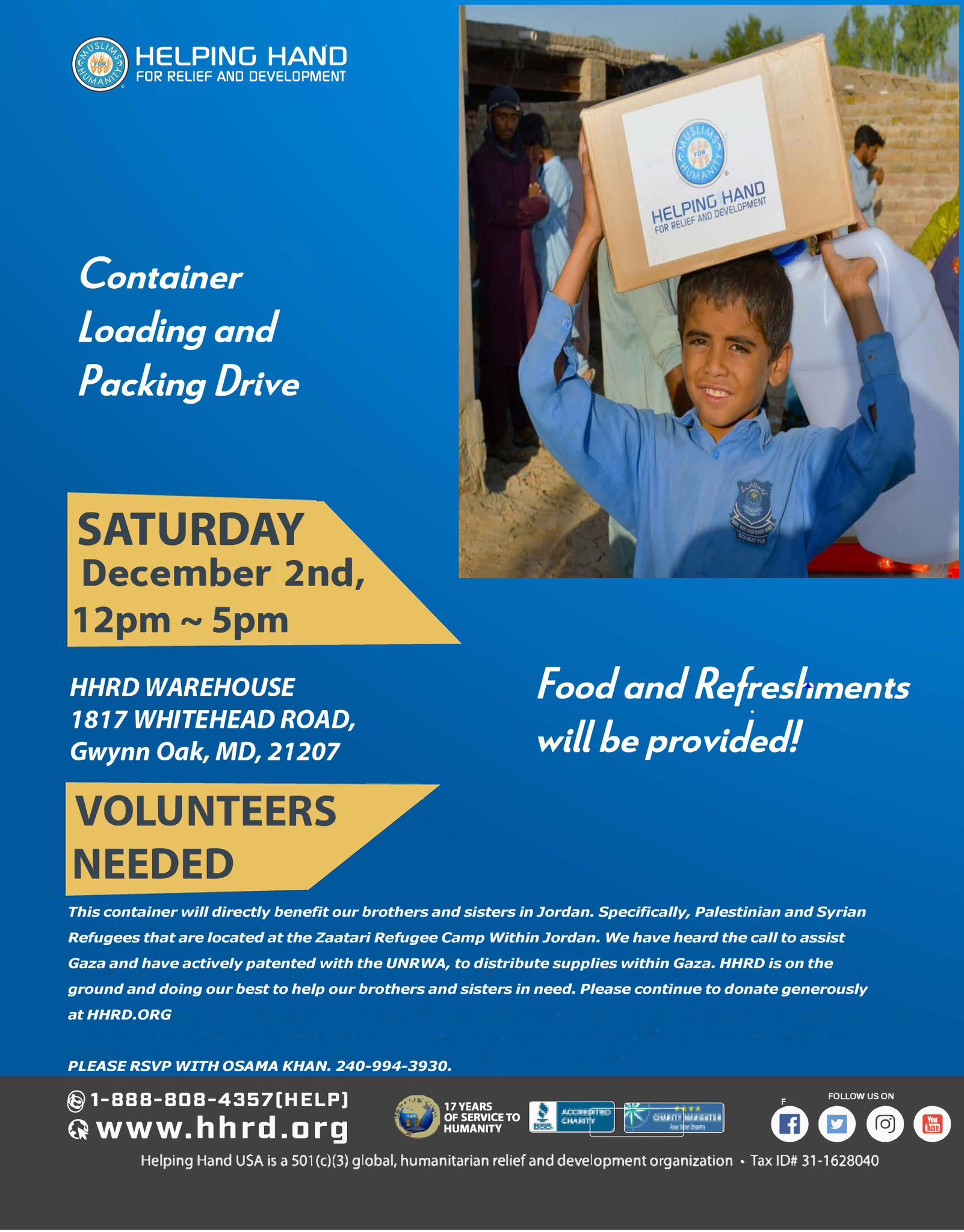 Please join us, as we will be talking about the volunteer event that will take place at the HHRD warehouse: located at 1817 Whitehead Rd, Woodlawn, MD 21207. Please look at the flyer below for details. Message me at airfan2@umbc.edu for any questions you may have regarding the event, which will take place this Saturday from 1-5 PM.