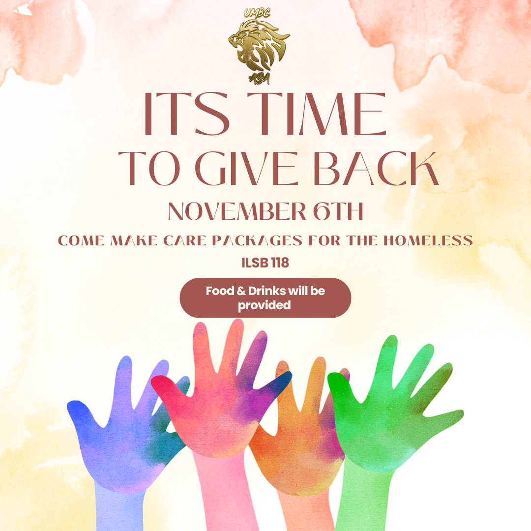 While We Love to hold events and have a good time, we want to dedicate time to giving back to our local community. Please Join us Today, November 13th at 7 PM in ILSB 118, as we make care packages for the homeless and less fortunate. During the cold Holiday Season help us make the time to pour back into the community!