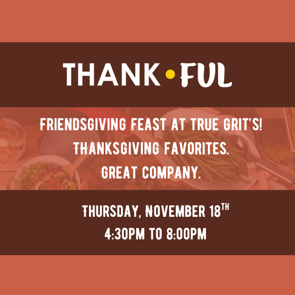 Join us for our Friendsgiving Dinner at True Grit's on November 18th—featuring all your Thanksgiving favorites and festive vibes!