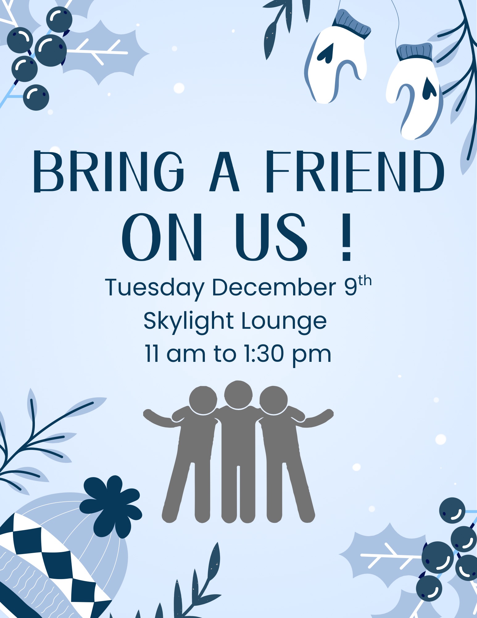 Join us in the Skylight Room for lunch and bring a friend on us!