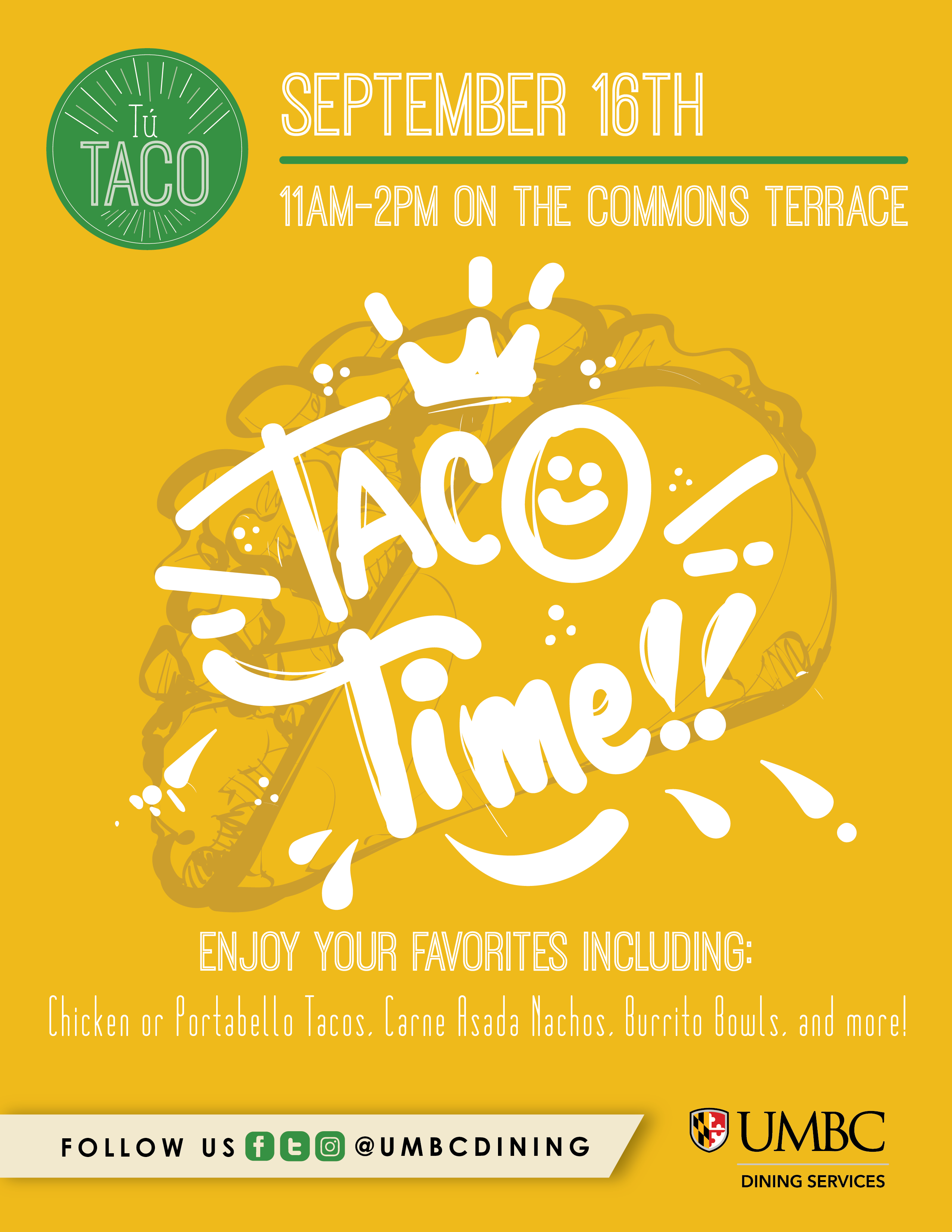 From 11am-2pm, join us outside on the Commons Terrace and enjoy Chicken and Portabello tacos, Carne Asada Nachos, Burrito Bowls, and more!
