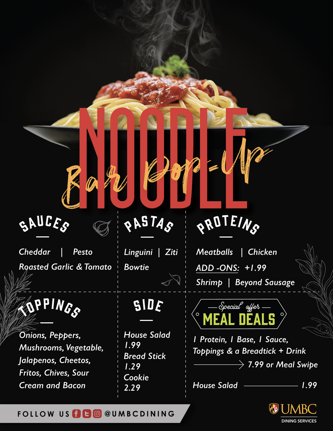 From 11am-2pm we'll be serving up a customized Noodle Bar for lunch including Linguini, Ziti, or Bowtie Pasta with toppings including onions, peppers, mushrooms, and more! You can even add on a salad or shrimp or Beyond Sausage!
