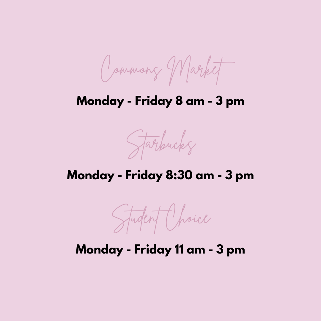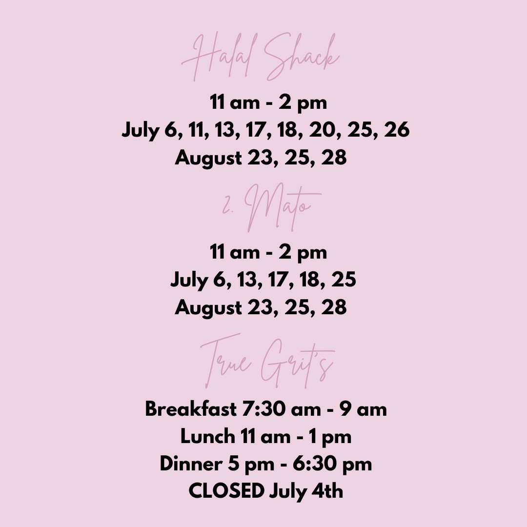 With the start of July, I wanted to repost our summer hours. Please note that all retail dining locations will be closed July 1st through July 4th and re-open on Wednesday, July 5th. True Grit's will have limited hours through the holiday weekend and be closed July 4th.