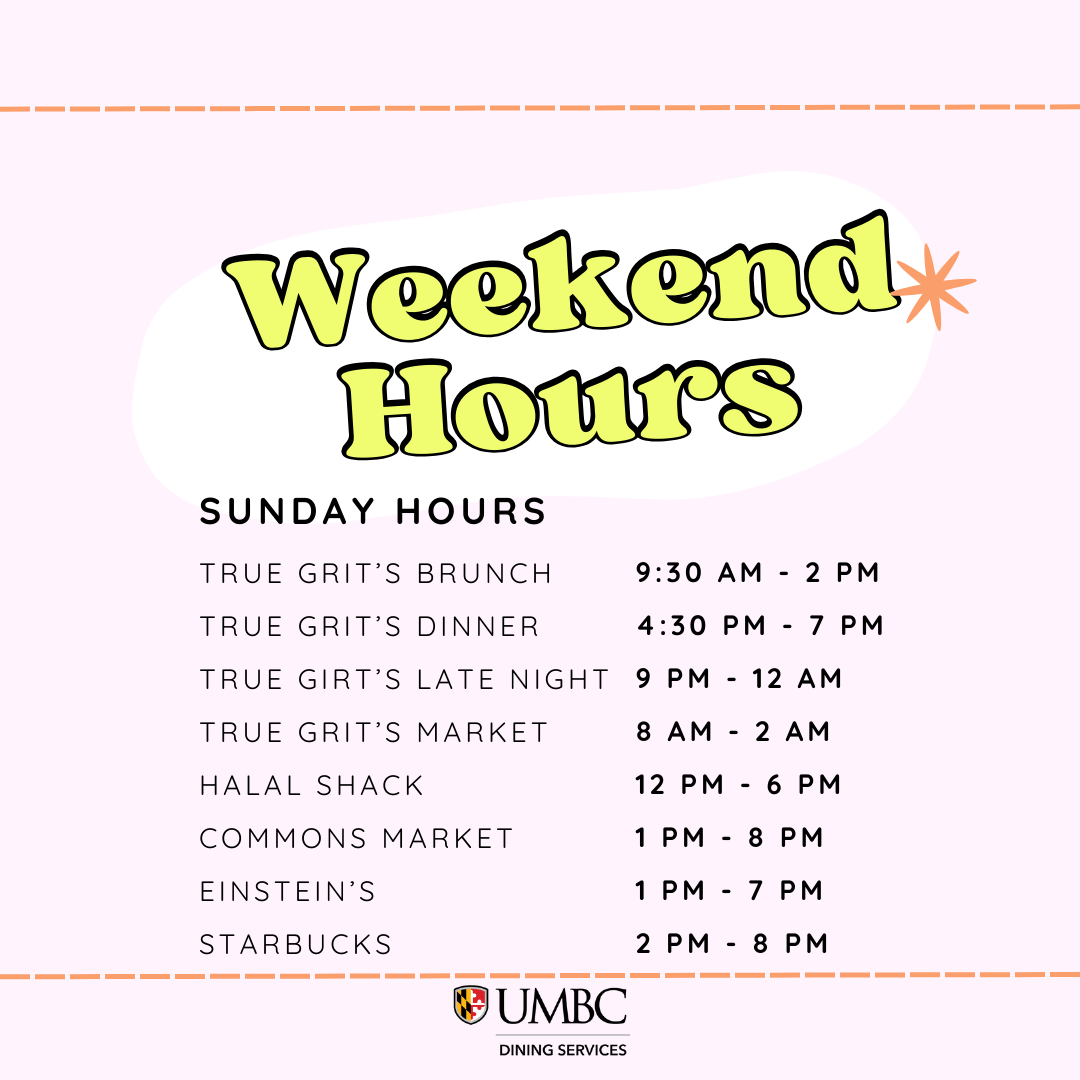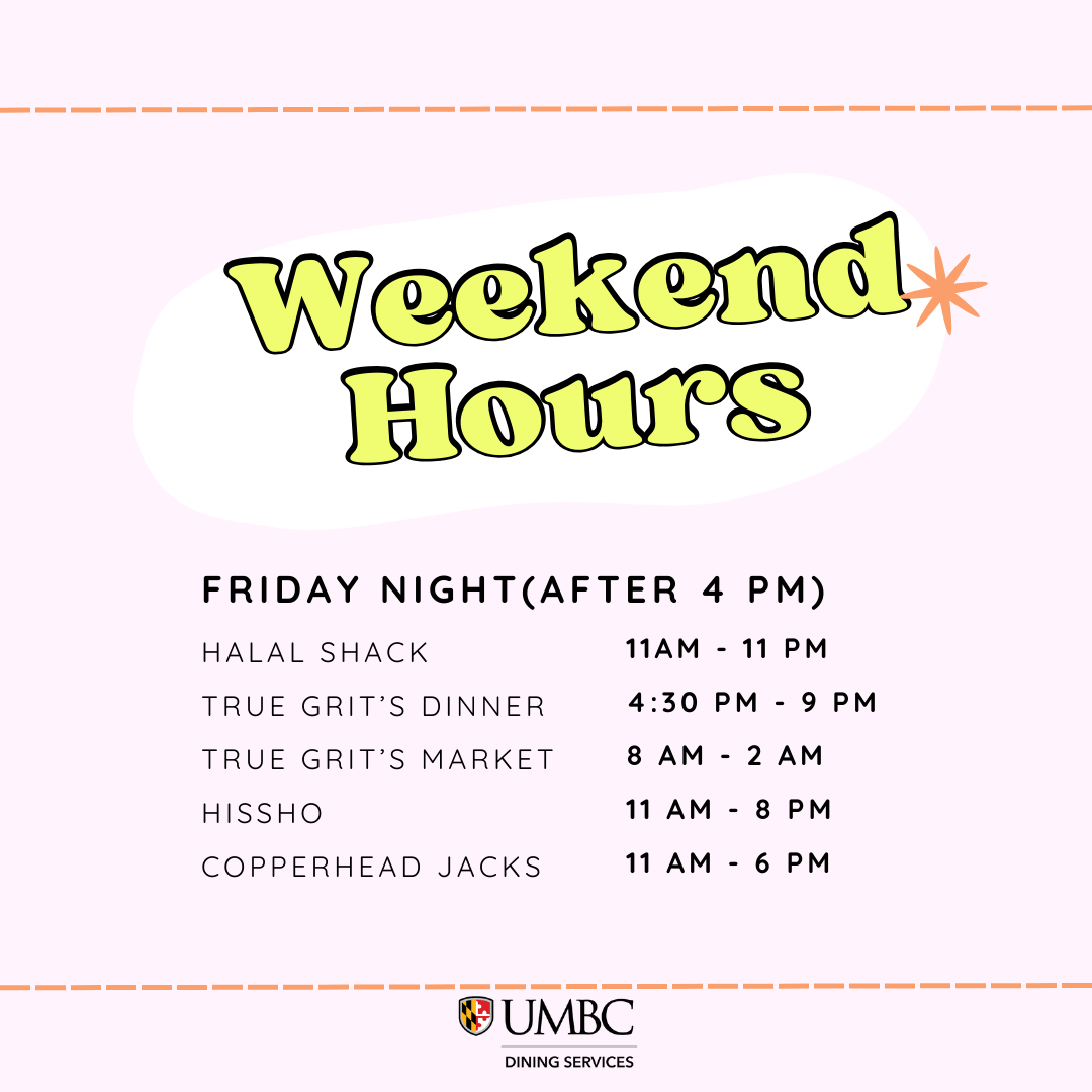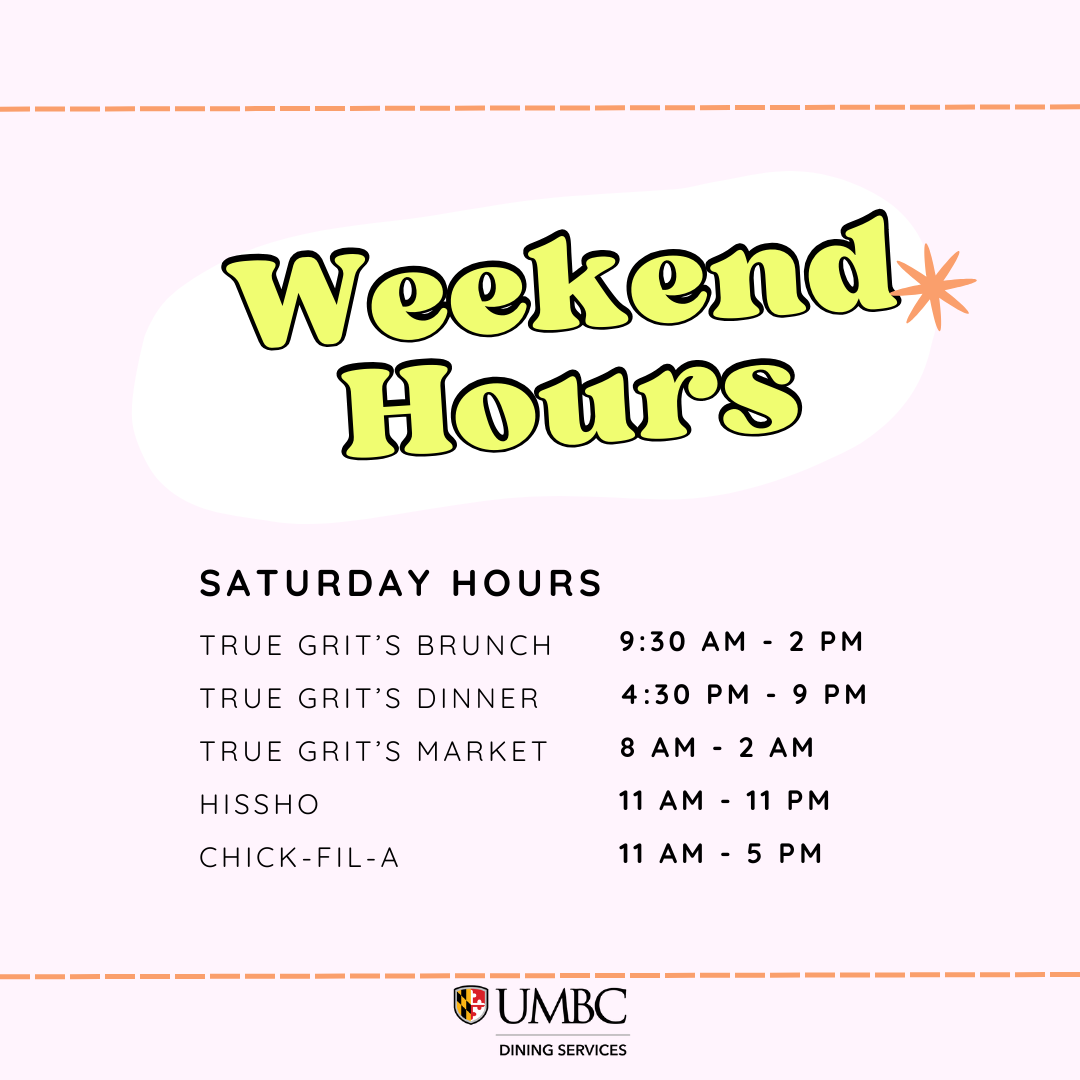 We made some changes to our weekend hours, please be sure to check out dineoncampus.com to see what's open. I've attached flyers to this post as well. Enjoy your weekend!