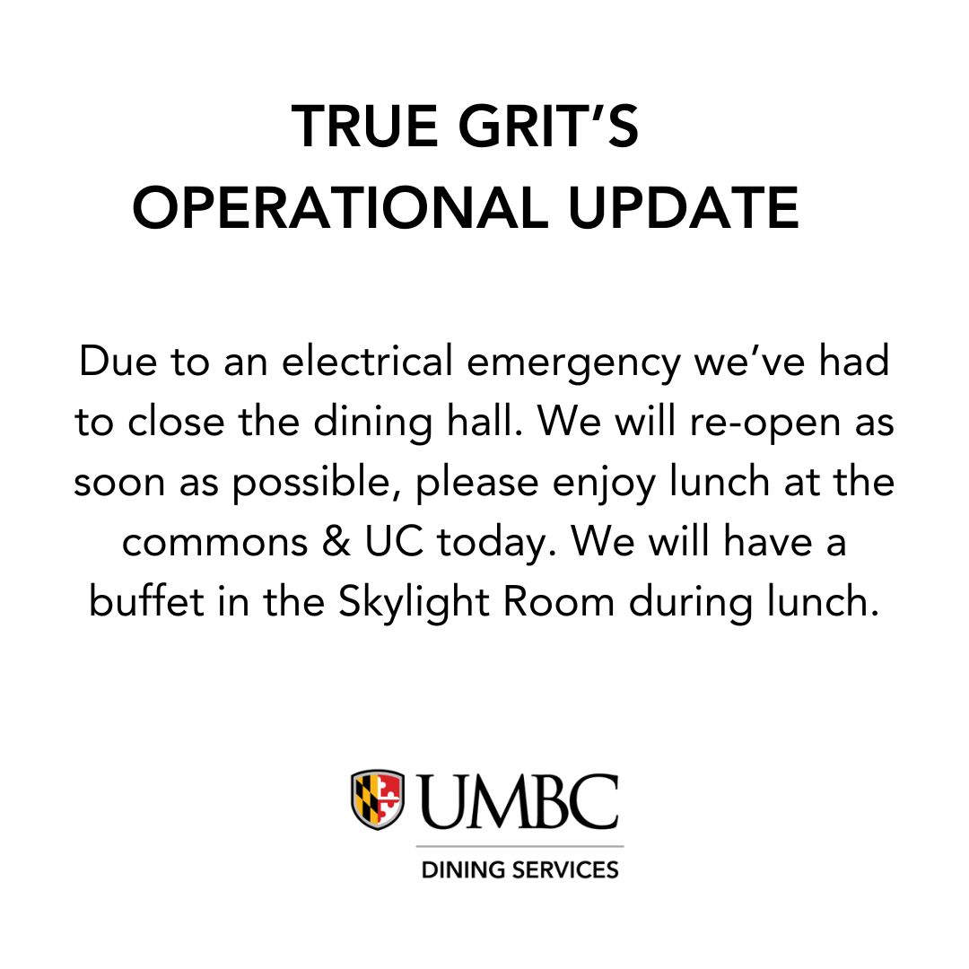 Due to an electrical emergency, True Grit's will be closed through lunch. We will re-open as soon as possible. Please enjoy lunch at The Commons & UC today.