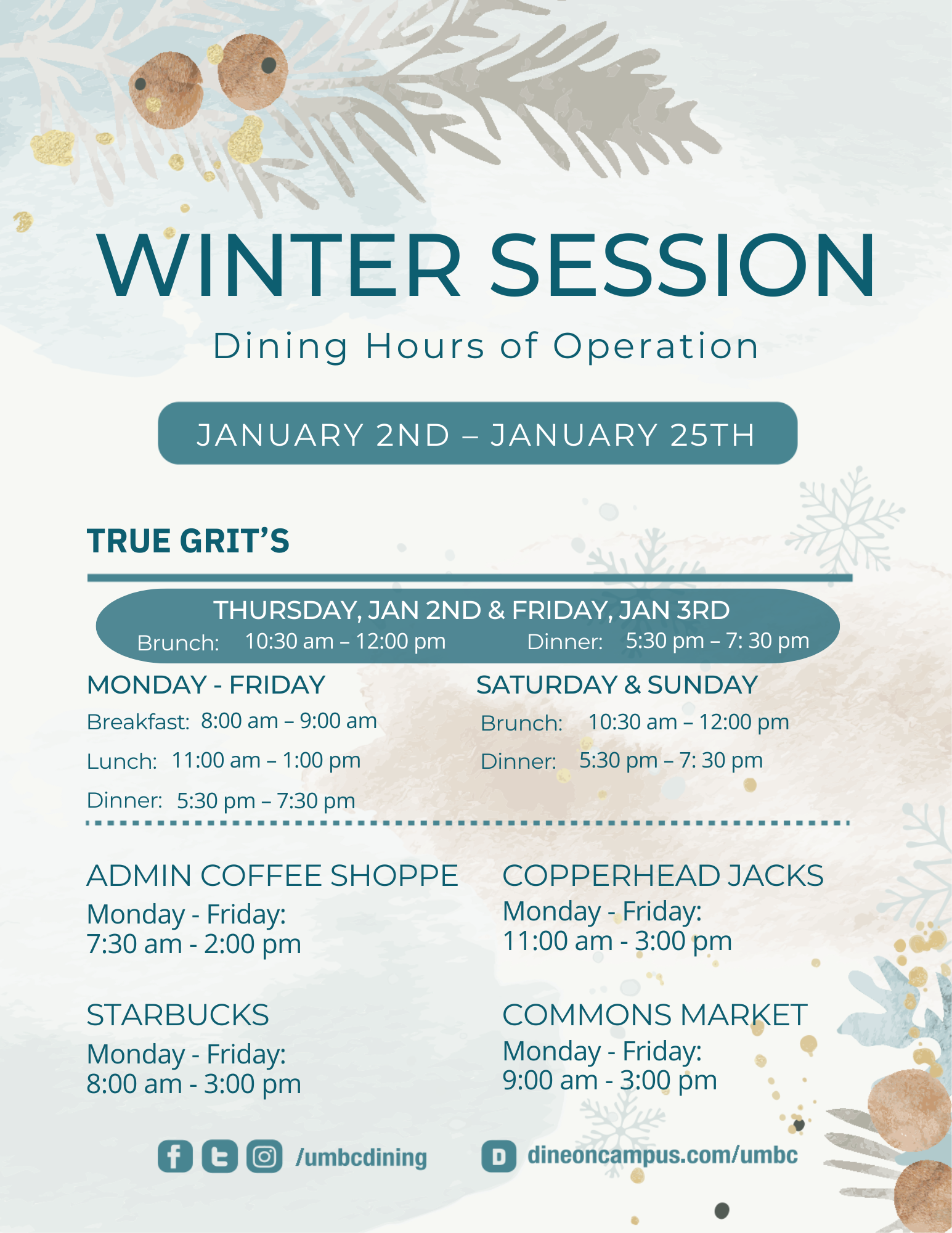 UMBC Dining Winter Hours are attached. The Commons Market, Copperhead Jack's, Starbucks and Admin Coffee will be open Monday - Friday in addition to True Grit's - hours for True Grit's were updated for January 2nd & 3rd on 12.19.24.