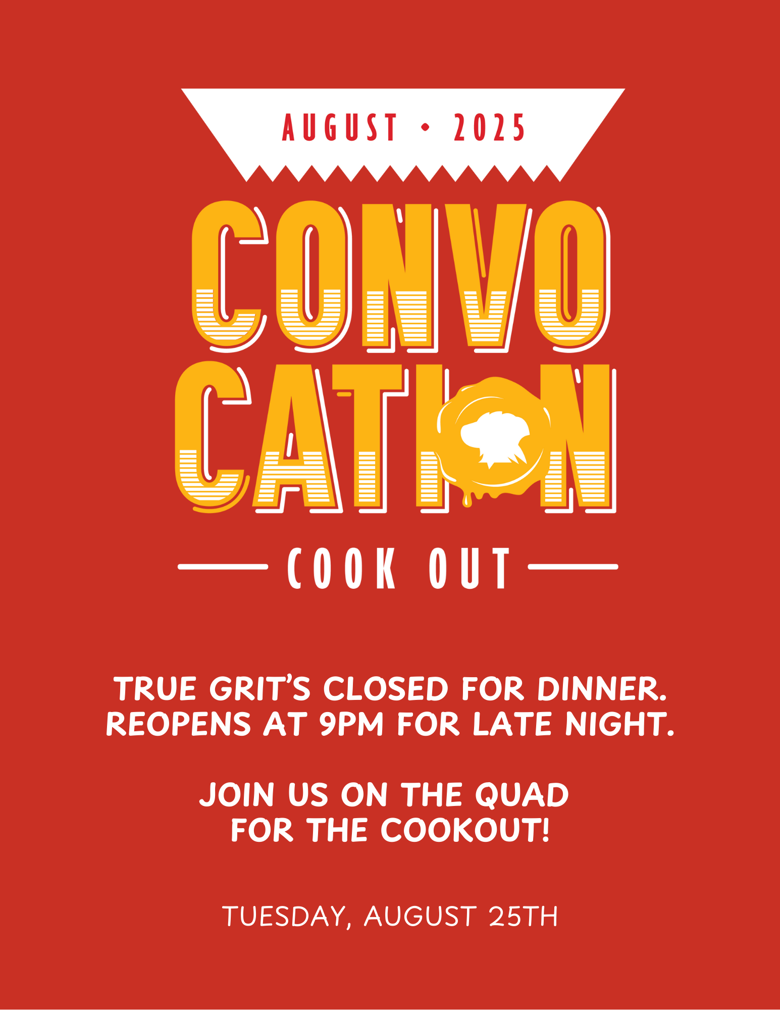 Convocation Cookout is happening TONIGHT! Join us on The Quad from 4:30pm–8pm for food, fun, and entertainment.