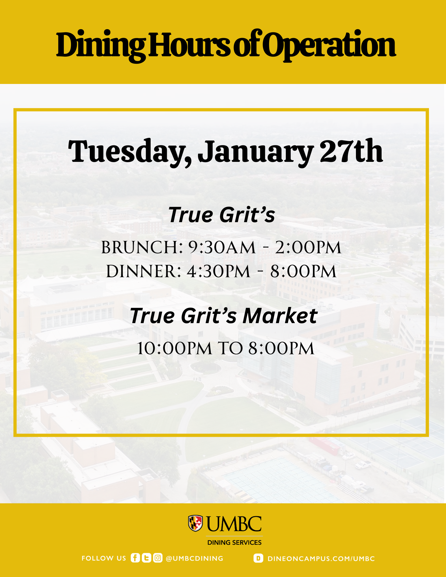 As campus closures continue for Tuesday, January 27, True Grit's Dining Hall will remain open and continue serving the UMBC community.