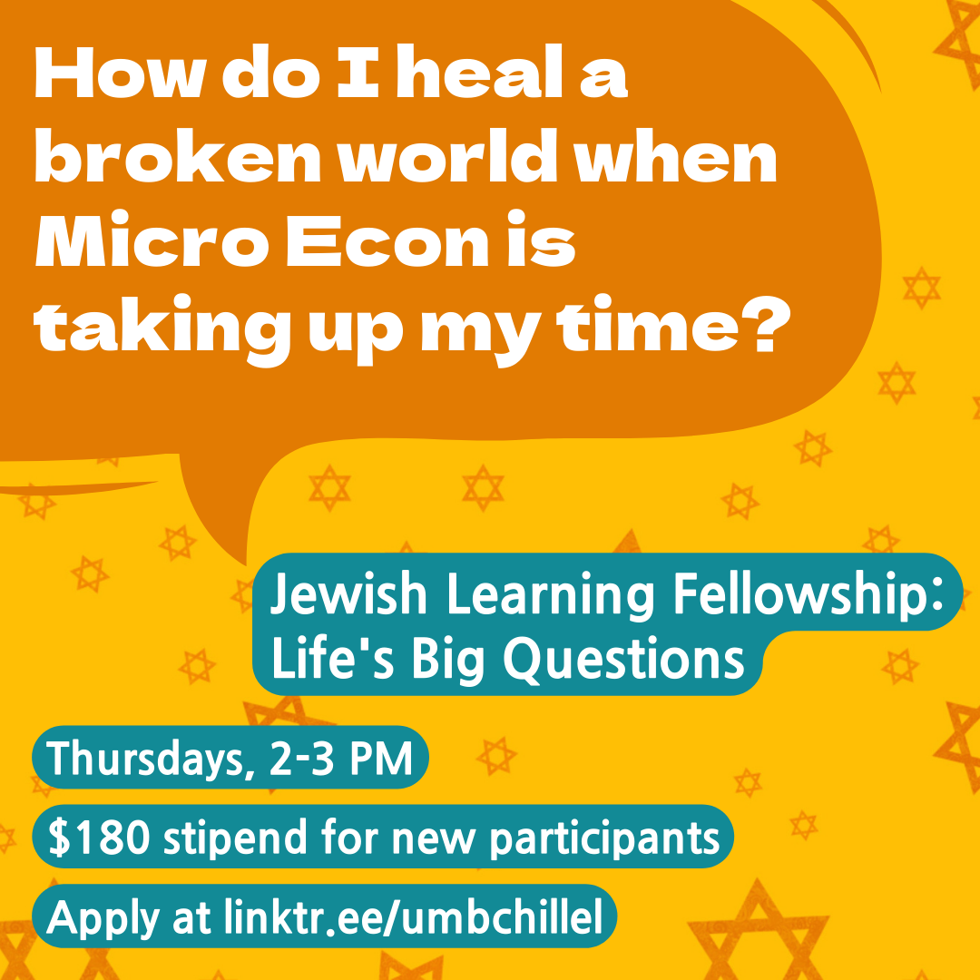 JLF: Life's Big Questions will be meeting this semester on Thursdays, 2-3 PM starting September 15. All first time participants will receive a $180 stipend (returning participants earn a $72 stipend)! Join us this semester as we ask the big questions: Who am I? What communities am I a part of? What is worth committing myself to, and why? Learn more and apply here!