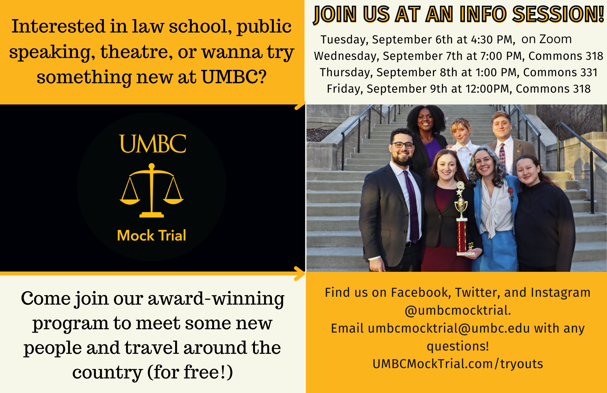 Go to www.UMBCMockTrial.com/tryouts to learn more about tryouts!