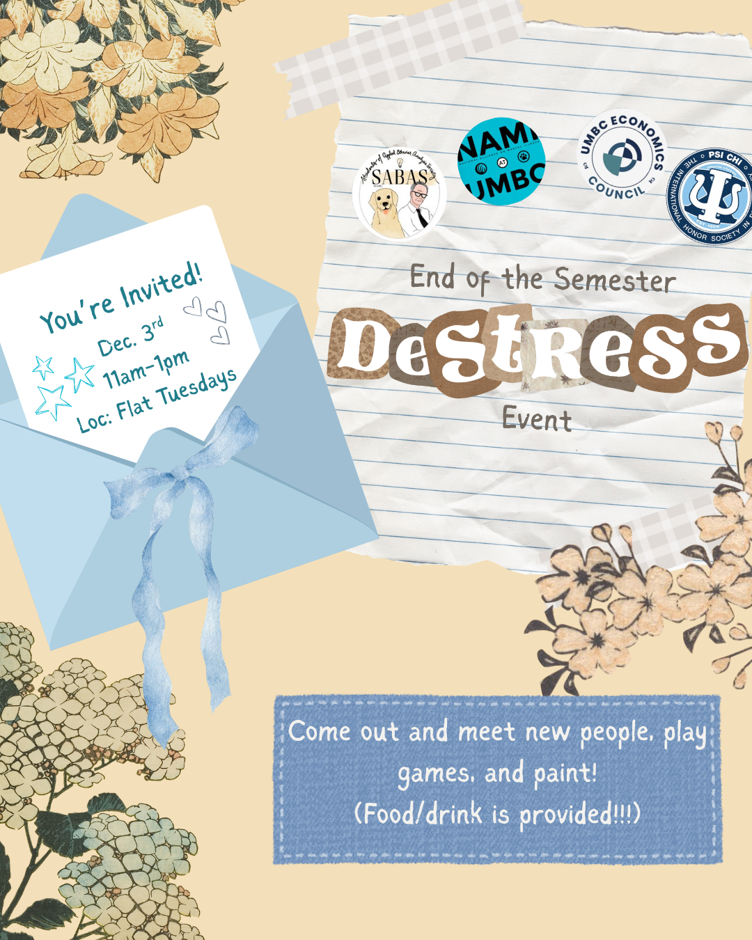 Join us at Flat Tuesdays for a chance to destress before finals by painting, playing games, and meeting new people! This event is a collaboration between UMBC NAMI, Psi Chi, SABAS, and the UMBC Economic Council. Food and drink will be provided!