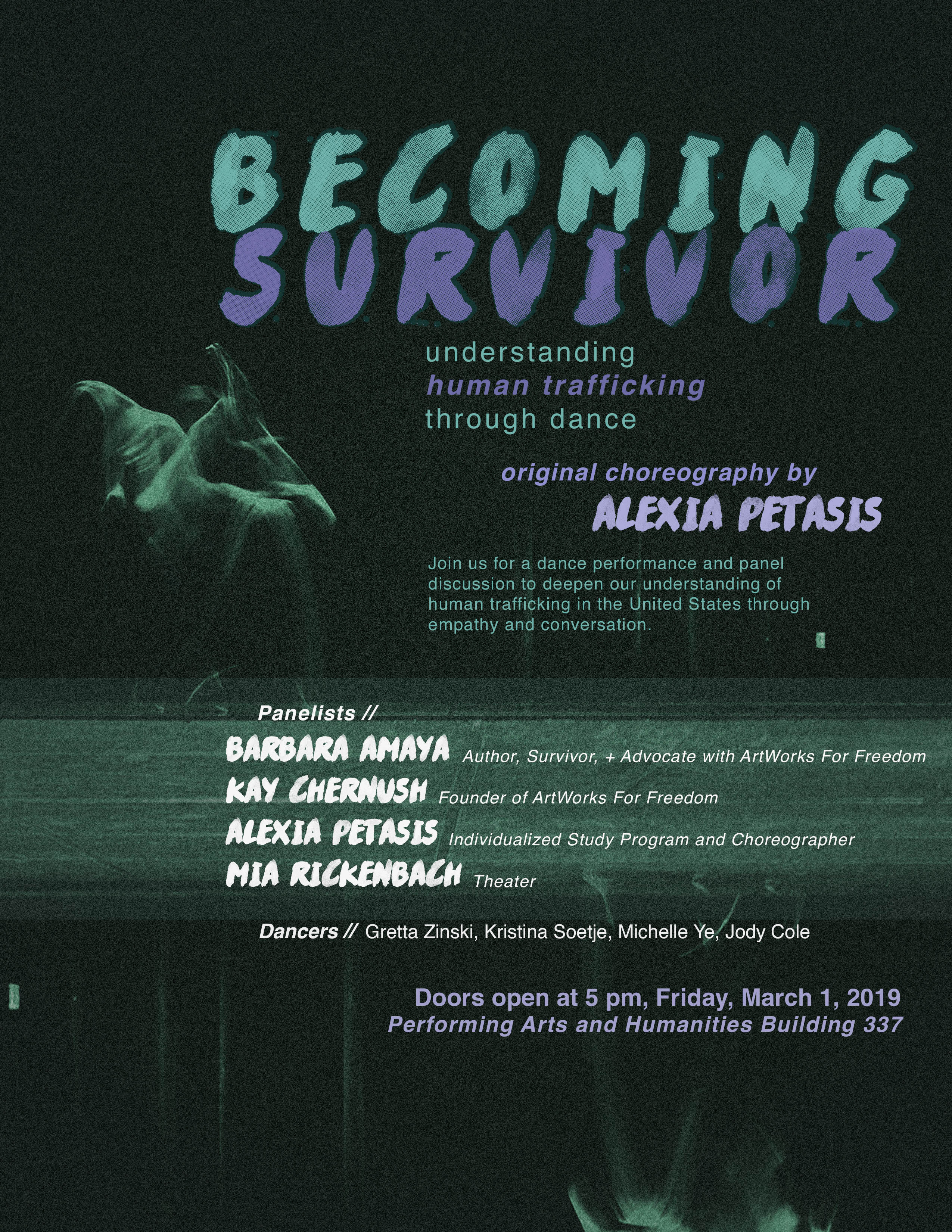 In recognition of Women's History Month, join us for a dance performance and panel discussion with INDS student and Women's Center student staff Alexia Petasis, to deepen our understanding of human trafficking in the United States through empathy and conversation.