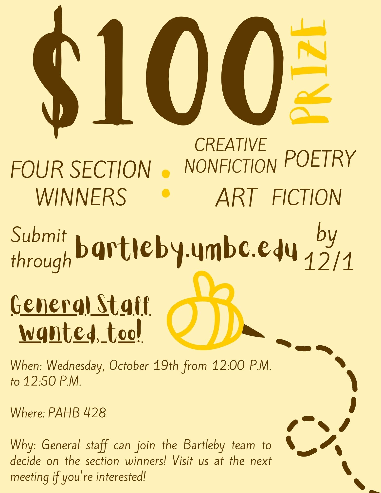 In addition, Bartleby is looking to fill in with more general staff! General staff engage in the voting process for the four winners of each section, what pieces of writing and art don't win but get published in the spring and help produce ideas for community involvement and Bartleby activities. If you're interested, mark your calendars for the next business meeting being in PAHB 428 from 12:00 to 12:50 on Wednesday, October 19th. See you there!"